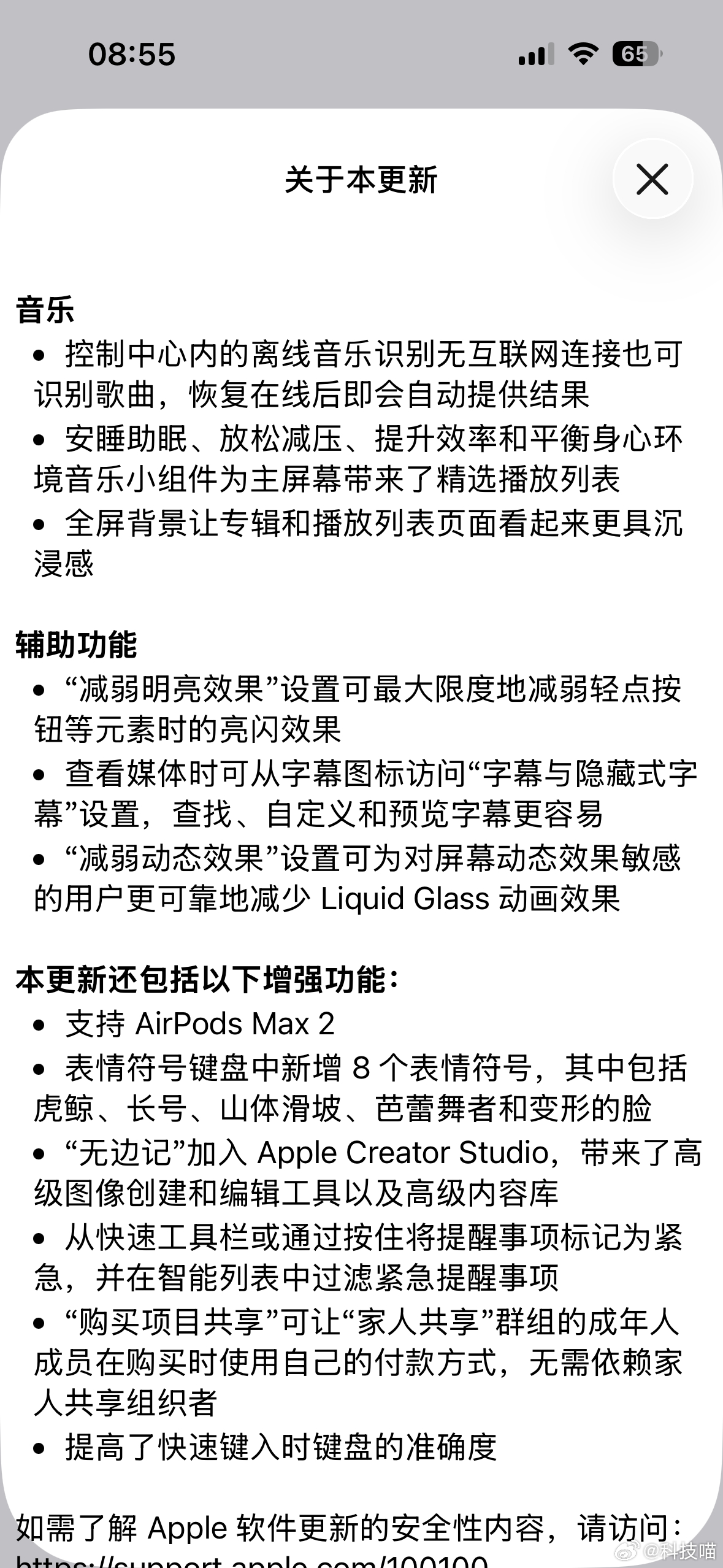 音乐:离线识曲 + 助眠/效率音乐组件 + 沉浸式专辑页• 辅助功能:减弱亮闪/动态效果 + 字幕设置优化• 其他:支持 AirPods Max 2、新增8个表情、无边记升级、提醒事项可标紧急、家人共享可独立付款、键盘更准