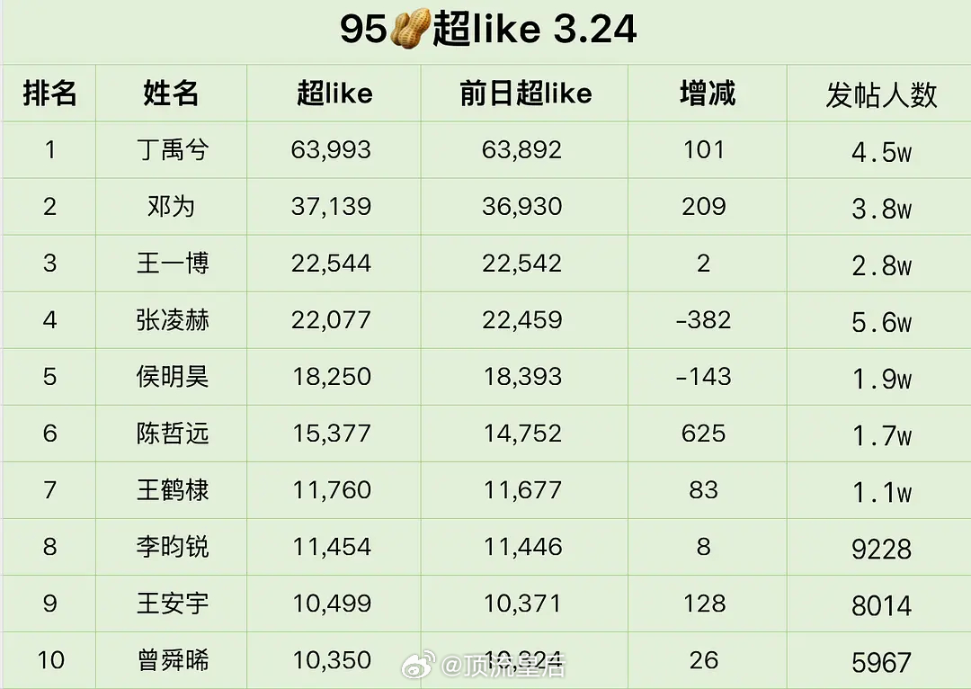 没记错的话最近统计的95生超like数量,丁禹兮一直都是断层第一。