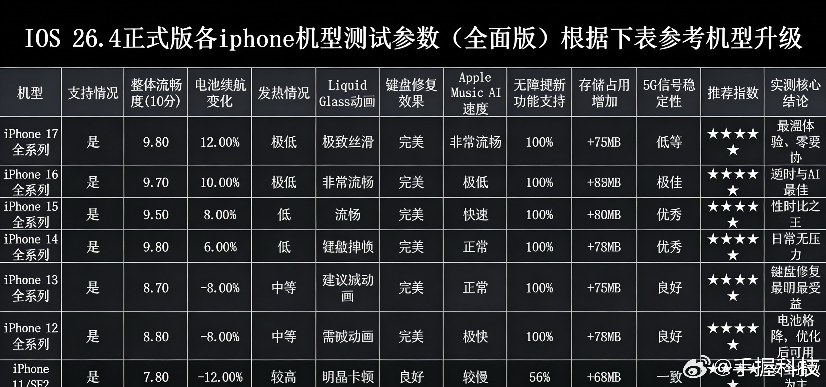 iPhone大量新功能上线更新反馈:16PM感觉动画速度会快一点点,桌面流畅性比26.3.1好,不知道是不是刚更新完,用app会有些小卡顿。有iPhone各机型更新ios26.4的整体测试情况,更还是不更看你们了。
