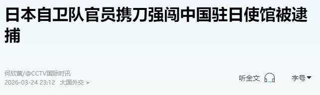 日本是在作死的边缘疯狂试探,这么下去,不出意外的话应该很快就会出意外。 3 月 24 日上午,发生了一件性质极其恶劣的事:一名 23 岁的日本陆上自卫队现役三等陆尉村田晃大,公然翻墙闯入中国驻日本大使馆,还携带了刃长 18 厘米的刀具,当场承认自己的行为非法,甚至放话要以 “神的名义” 杀死中国外交人员。 这件事不是简单的个人闹事,而是日本在对华关系上持续作死、疯狂试探底线的真实写照,再这么放任不管、一意孤行,日本很快就会为自己的行为付出惨痛代价,不出意外地出大意外。 中国驻日本大使馆是受国际法保护的外交场所,按照《维也纳外交关系公约》,驻在国必须无条件保障外国使馆的安全、保障外交人员的人身安全,这是国际社会公认的基本准则,也是国与国交往的底线。 日本作为当事国,本该履行好保护义务,可现实是,一名现役的自卫队人员,能轻易翻墙闯入中国使馆,还能携带刀具做出威胁生命的行为,这足以说明日本在安全管控、人员管理上存在严重漏洞,更暴露了日本国内极右翼思潮泛滥、自卫队内部极端化倾向明显的严重问题。 事件发生后,中国驻日本大使馆第一时间向日方提出严正交涉和强烈抗议,外交部也明确表态,要求日方立即彻查事件、严惩涉事人员,给出负责任的交代,同时必须切实采取措施,保障中国驻日使领馆人员、馆舍和在日中国公民的安全,杜绝类似事件再次发生。 中方的态度清晰又坚决,外交场所的安全不容侵犯,中国外交人员的生命安全不容威胁,任何挑衅行为都必须付出代价。 可回头看日本的表现,实在让人失望。事发后,日本方面只是简单逮捕了涉事人员,陆上自卫队表示会配合调查,没有第一时间主动道歉,没有深刻反思自身管理的严重问题,更没有对国内泛滥的极右翼势力、自卫队的极端思想进行有效整治。 这种敷衍了事、轻描淡写的处理方式,本质上就是对挑衅行为的纵容,是在继续触碰中国的底线,是在作死的边缘越走越远。 这次自卫队人员持刀闯馆威胁外交人员,不是偶然事件,而是日本长期纵容极端势力、放松自我管控、执意对华挑衅的必然结果。 一个国家的现役军人,敢公然闯入外国使馆威胁外交人员,这在国际上都是极其罕见的恶性事件,足以看出日本内部的混乱和危险。 日本政府如果还不警醒,不彻底整治极端思潮,不严格约束自卫队人员,不认真履行保护外国使馆的国际义务,只是一味地敷衍、纵容、试探,只会让事态越来越严重。 中国一直秉持和平发展的理念,坚持与邻为善、以邻为伴,希望和日本保持正常的国家间关系。但中国的善意和克制,从来不是日本可以肆意挑衅的理由,中国的底线更是不容任何国家触碰。 外交场所的安全、外交人员的安全,是国家主权的延伸,是绝对不能退让的红线。日本不管是政府层面的军事挑衅,还是民间和自卫队人员的恶意滋事,只要触碰了这条红线,中国都会坚决反击、绝不姑息。 现在的日本,就像一个无视规则、肆意妄为的人,一次次踩着红线试探,以为别人的克制是软弱,以为自己的小动作不会引发严重后果。可国际交往有明确的规则,国家主权有不可触碰的底线,任何作死的试探,最终都会自食恶果。 这次是自卫队人员闯馆威胁,下次可能会出现更恶劣、更危险的事件,日本如果继续执迷不悟,不及时纠正错误,不停止挑衅行为,不出意外的话,很快就会迎来无法挽回的严重后果,到时候再想补救,就已经来不及了。 日本应该清醒认识到,中国维护国家主权、安全和发展利益的决心坚定不移,保护海外外交人员和机构安全的能力毋庸置疑。 放弃挑衅、遵守规则、履行义务,才是日本唯一正确的选择。如果继续在作死的道路上狂奔,等待日本的,只会是自己酿成的苦果,以及国际社会的一致谴责和反对。