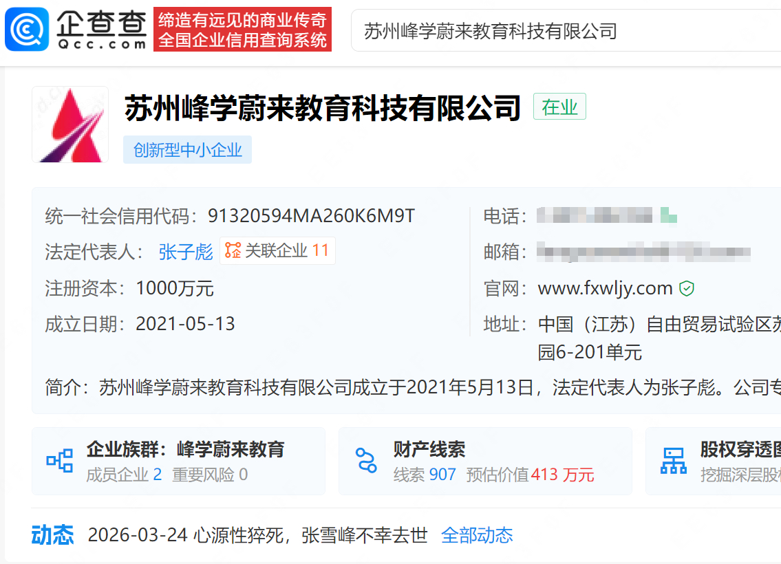 【张雪峰公司还有273名员工】张雪峰公司注册多枚女儿姓名商标3月24日晚,苏州峰学蔚来教育科技有限公司发布讣告确认,张雪峰因心源性猝死全力抢救无效逝世。