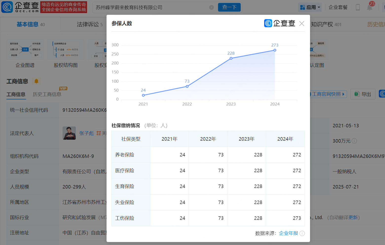 企查查APP显示,苏州峰学蔚来教育科技有限公司成立于2021年5月,注册资本1000万元,经营范围包含出版物零售、出版物批发、电子出版物制作、中小学教科书发行等,由张子彪(张雪峰)直接持股75%并任法定代表人、执行董事。2024年年报信息显示,该公司参保人数为273人。