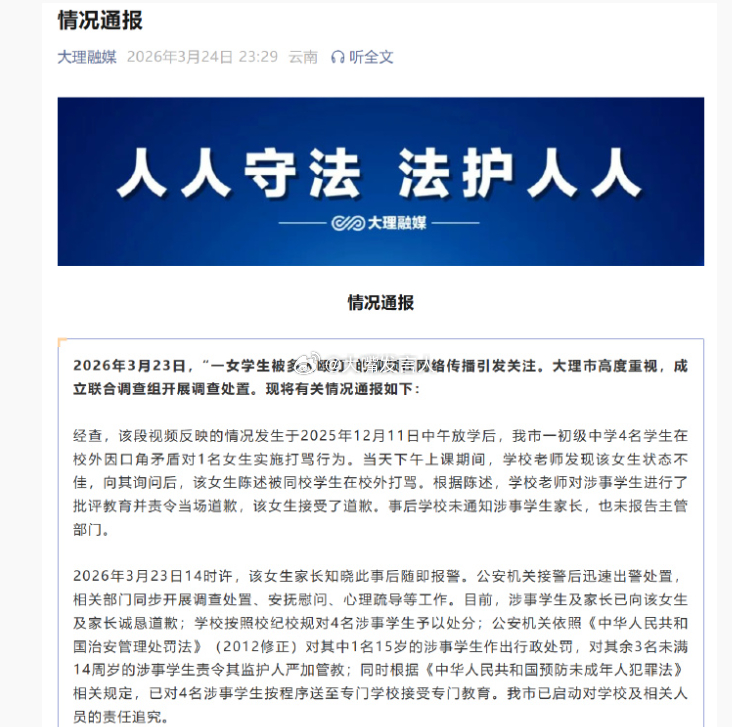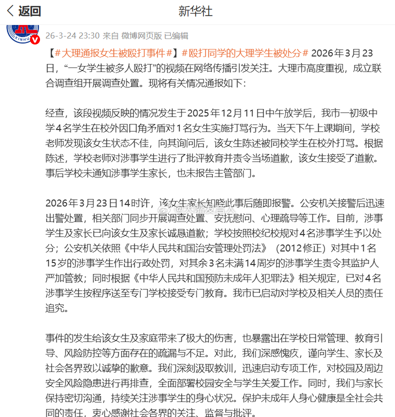 大理通报女生被殴打事件 家长做得对,第一时间报警学校处置只想息事宁人、把事捂住暴力就是暴力,尤其是这种以多打少的暴力【学校老师对涉事学生进行了批评教育并责令当场道歉,该女生接受了道歉。事后学校未通知涉事学生家长,也未报告主管部门~~~我市已启动对学校及相关人员的责任追究。】殴打同学的大理学生被处分 ,热点观点