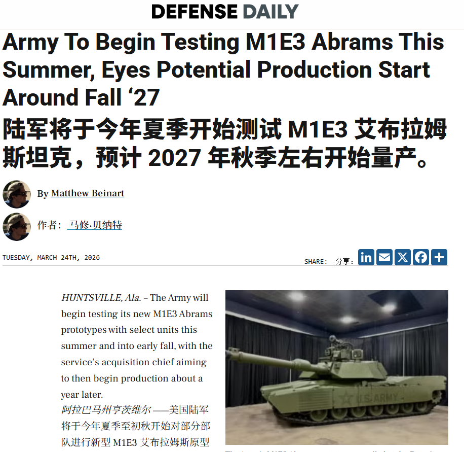 MD三等人下一代主战坦克 M1E3 艾布拉姆斯正加速推进:三等人计划今年夏季至初秋将全部四辆原型车交付部队测试,测试结束后约12个月内力争启动量产,而传统的研发周期通常为 6-7 年。M1E3项目已取代原 M1A2 SEPv4升级方案,转向更具未来作战能力的全新设计。