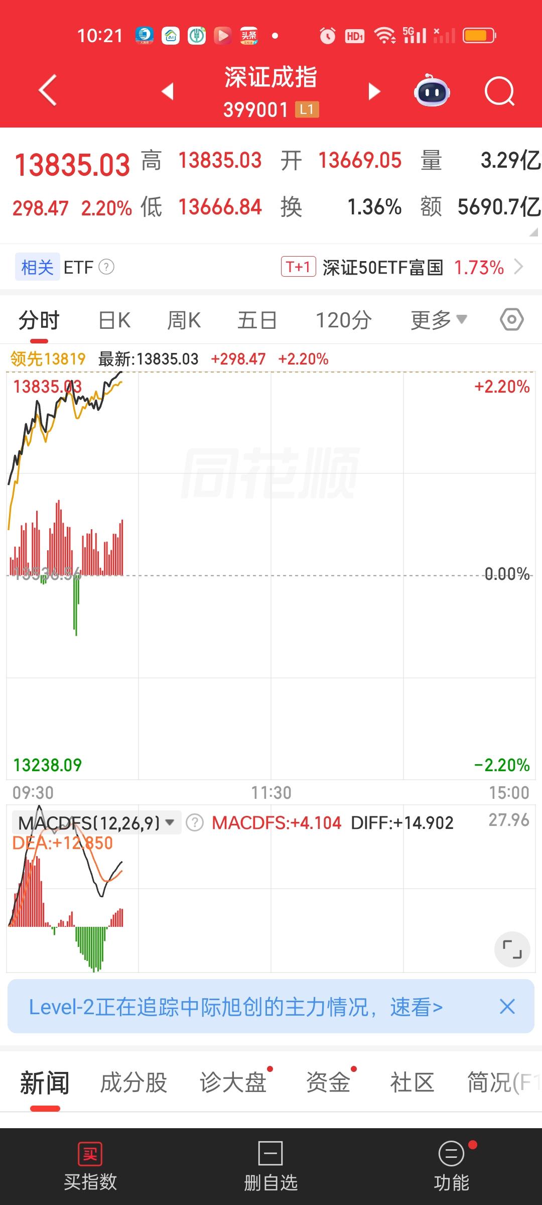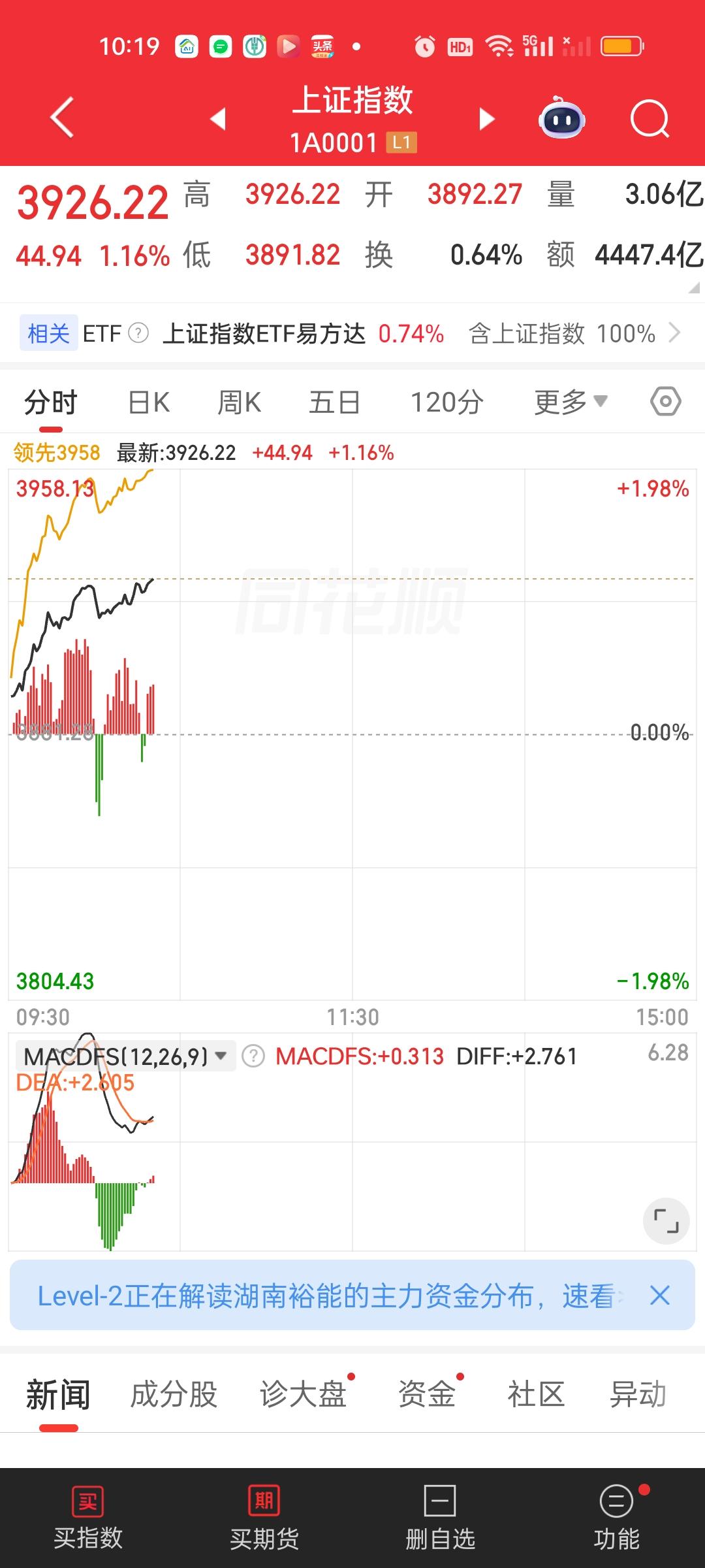 40分钟成交量破万亿,大盘资金净流入307.5亿。个股有超过5000家上涨,有53家涨停。大盘最起码表面上给人的感觉是非常强的,还是要盯紧量能。这个地方有冲不上去的感觉了。冲不上去自然就会不进则退。那就还是存在跳水的可能。