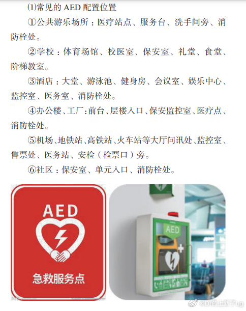 4⃣ 建议政府在学校、机场、火车站、高铁站、汽车站、地铁站、医疗机构、体育场馆、大型超市、百货商场、影剧院、游乐场等人口密集、流动量大的场所及高危人群家庭配置 AED 及相关应急设备。