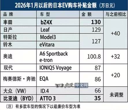 从实际结果看,丰田、日产、铃木还有特斯拉这些日系和美系品牌,那可是享受着高额补贴红利,可咱们中国的比亚迪呢,就被区别对待了。就拿比亚迪旗下元PLUS(ATTO 3)等四款纯电车型来说,补贴一点都没上调,还维持在35万至45万日元区间。和日系、美系同级车型那高达127万至130万日元的补贴一比,差距最大能达到95万日元,约合人民币4万元呢!