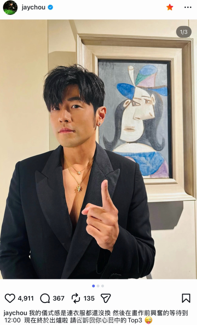周杰伦也在零点蹲新歌 周杰伦0点蹲新歌:“我的仪式感是连衣服都还没换,然后在画作前兴奋地等待到12:00,现在终于出炉啦,请告诉我你心目中的Top3?”