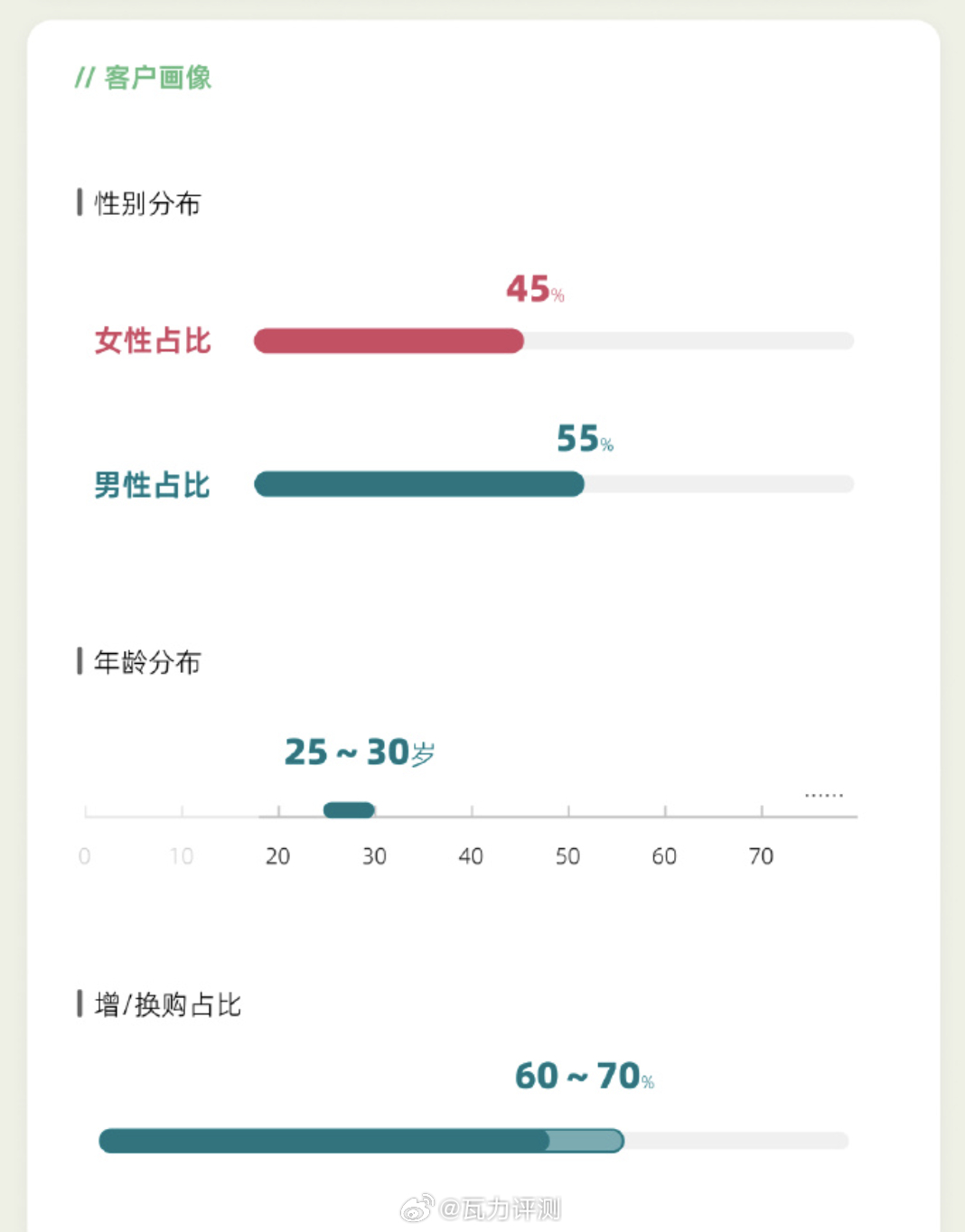 至于客户画像:25~30岁,女性比例:45%,增换购比例:60~70%