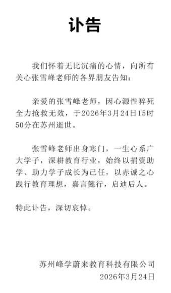 2018年,张雪峰发微博说:“如果有一天,让我选择一种死法,我最希望的,是猝死如果让我定个时间,我希望是,不久的将来”。后来2024年直播的时候,有网友说:张老师,你的嘴唇发紫发黑,可能是心脏不好,而张雪峰怒怼网友:你跑不过我信吗?我跑半马的人说我心脏不好,你说我肾不好我都认。没想到,如今,这些话一语成谶! 2018年,张雪峰的那条微博,大家只当是高强度工作下的一句吐槽,一句发泄情绪的气话。 日子一天天过,他依旧连轴转,赶场讲课、开直播、答疑解惑,日程排得满当当,常年奔波,靠高强度输出站稳脚跟,也把身体的透支一点点堆在了一起。 时间到了2024年,他照常开直播,有网友盯着屏幕,发了一条弹幕,张老师,你的嘴唇发紫发黑,可能是心脏不好,抽空查查吧。 这句话戳到了他,张雪峰没把网友的提醒放在心上,反而对着镜头语气带着不服气,还有点较真的怒怼,他觉得自己经常锻炼,能跑半马,体能没问题,心脏更不可能出状况。 嘴唇发紫发黑,放到医学上来说,大概率是血氧偏低,这种信号不是小事,往往是心脏在发出预警,提醒人该停一停、查一查。 之前他就出现过胸闷心悸的情况,甚至被医院强制收治住院,要求安心休养,可出院后,很快回到工作岗位,没有放慢脚步,也没有彻底排查心脏问题。 他坚信自己体能过硬,忽视了身体发出的细微异常,也忘了当年那句随口的感慨,谁也没料到,2018年的那句微博,最后真的一语成谶。 后续他因心源性猝死离世,医院给出明确诊断,发病急、进展快,符合猝死的特征。 回看整个过程,从当年吐槽式的猝死愿望,到直播里无视嘴唇发紫的预警,再到最后突发意外,每一步都有迹可循,不是突然发生,而是长期透支叠加忽视信号的结果。 他用自身经历印证了一件事,长期高强度消耗,再壮的体能也扛不住。身体发出的预警信号,从来都不是多余的提醒,能跑半马不代表内脏器官没有隐患,外表硬朗也不等于内部机能完全健康。 很多人都有过类似的状态。忙起来不顾身体,觉得小病小痛扛一扛就过,对异常信号视而不见,等到真正出事,再想补救已经来不及。 张雪峰的这件事,没有夸张渲染,全是公开可查的事实,当年的微博有迹可循,2024年直播怒怼的片段有录屏留存,后续离世消息由官方讣告确认。 他不是个例,而是很多高压打拼人群的缩影,只顾着往前赶路,忘了停下来照顾身体,身体的预警,一定要当真。别等来不及了,才后悔没有早点重视。 以上部分内容是小编个人看法,如果您也认同,麻烦点赞支持!有更好的见解也欢迎在评论区留言,方便大家一同探讨。