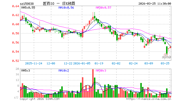 3月25日,截止午间收盘,医药50ETF博时(159838)涨0.55%,报0.550元,成交额47.50万元。医药50ETF博时(159838)重仓股方面,药明康德截止午盘跌0.37%,迈瑞医疗涨0.70%,恒瑞医药涨0.63%,联影医疗涨0.29%,爱尔眼科涨0.21%,新和成跌2.52%,华东医药涨0.74%,科伦药业涨0.94%,长春高新涨1.00%,康龙化成涨0.43%。