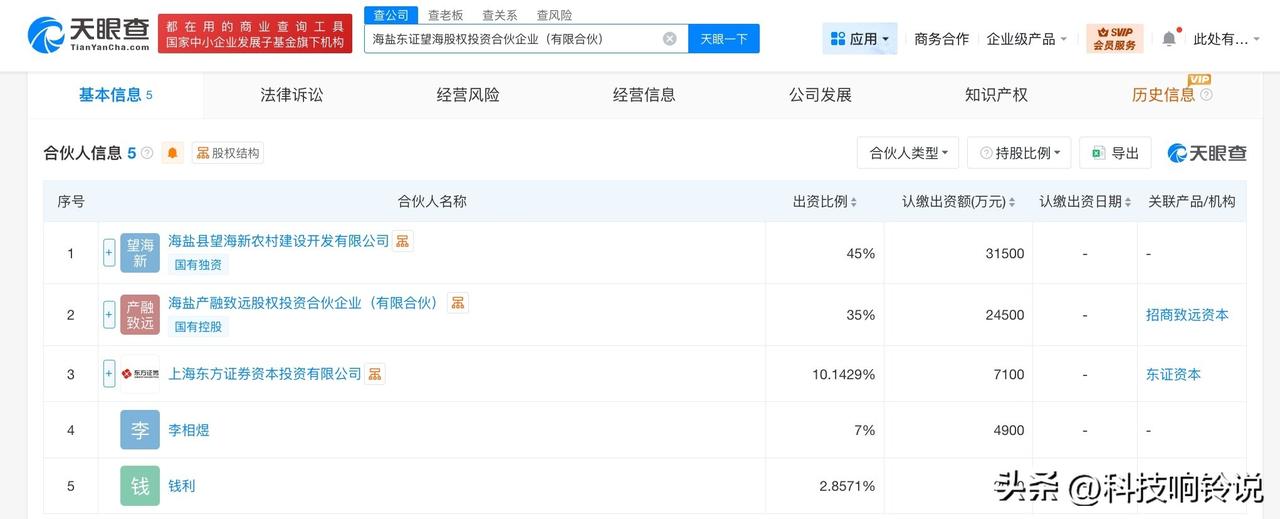 【东方证券等在嘉兴成立股权投资合伙企业 出资额7亿】 天眼查工商信息显示,近日,海盐东证望海股权投资合伙企业(有限合伙)成立,执行事务合伙人为上海东方证券资本投资有限公司,出资额7亿人民币,经营范围为以私募基金从事股权投资、投资管理、资产管理等活动,创业投资。合伙人信息显示,该合伙企业由海盐县望海新农村建设开发有限公司、海盐产融致远股权投资合伙企业(有限合伙)、东方证券(600958)旗下上海东方证券资本投资有限公司等共同出资。 天眼查信息:
