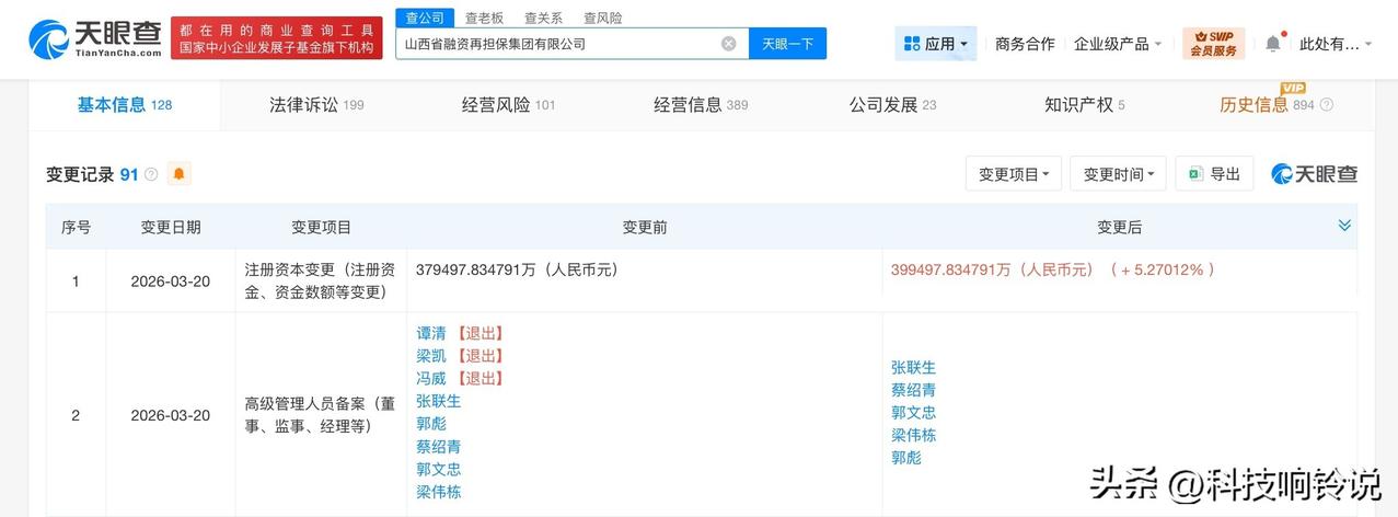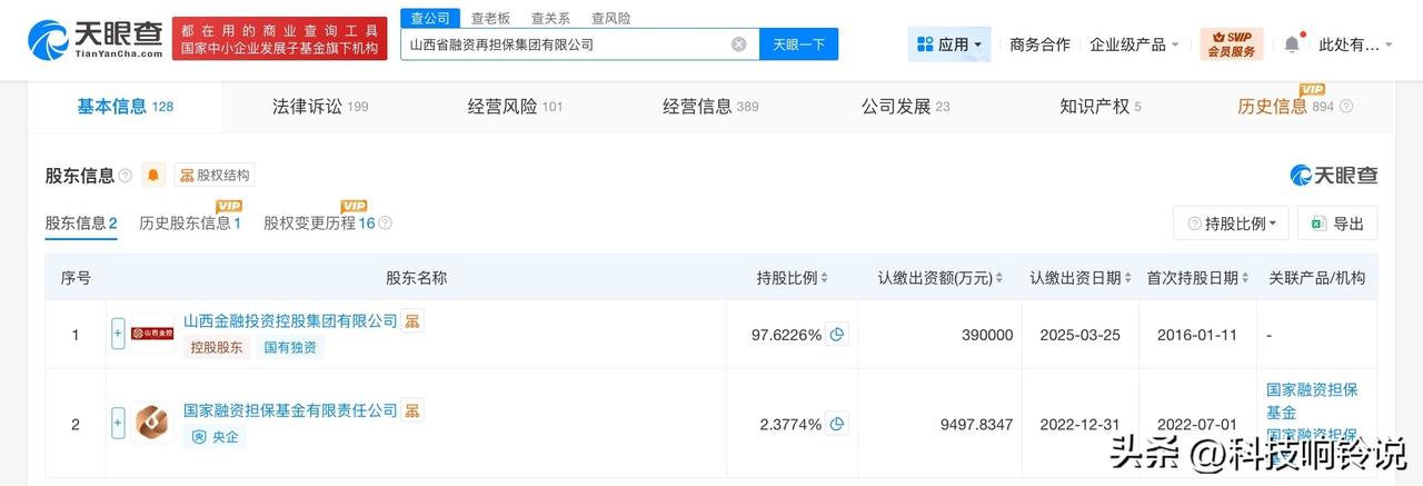 【山西省融资再担保集团增资至约39.9亿】 天眼查工商信息显示,近日,山西省融资再担保集团有限公司发生工商变更,注册资本由约37.9亿人民币增至约39.9亿人民币。 该公司成立于2000年7月,法定代表人为郭彪,经营范围包括融资担保业务、非融资担保服务等。股东信息显示,该公司由山西金融投资控股集团有限公司、国家融资担保基金有限责任公司共同持股。 天眼查信息: