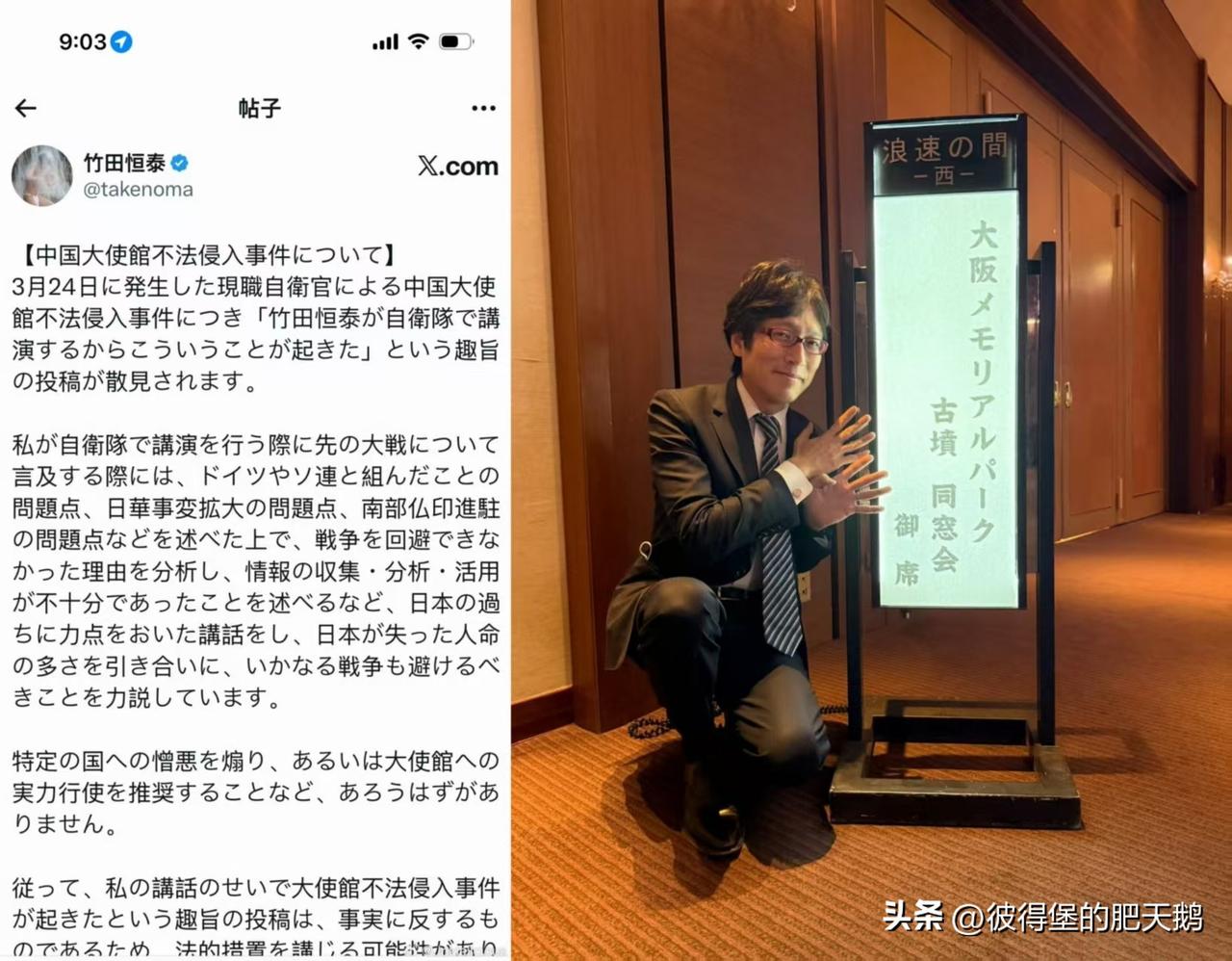日本极右翼学者竹田恒泰因为日本自卫队人员闯入中国使馆事件被很多日本人拉出来顶锅,因为这个家伙发表过很多暴论,说中国要完蛋了中国是万恶之源,而且经常在自卫队开展活动对自卫队军官公开演讲。 然后这次出了自卫队现役说要代替神杀害中国使馆人员这种事情,又出来写一些什么自己从来没有“煽动对某个国家的仇恨”这种事情。 竹田恒泰这些年公开发表过的一些暴论。竹田恒泰,日本保守派作家、皇室相关人士(自称天皇家族后裔),同时经营多家企业,曾获山本七平赏,经常在自卫队内部演讲, 他曾出版《有趣但笑不出来的中国故事》等书,书中出现“中国人是否与我们是同一种人类都值得怀疑”“世界上最野蛮的军国主义国家就是中华人民共和国”等极端表述。 他还多次宣称日本没有和如今的新中国打过仗所以没有历史责任,把中国塑造为世界公敌。并且他最近的帖子也是在宣传日本应该继续使用“支 那”那称呼中国,相关的帖子有上数百万阅读量和数万点赞。 “原子弹之下无冤魂”并非毫无道理。 #热点解读#