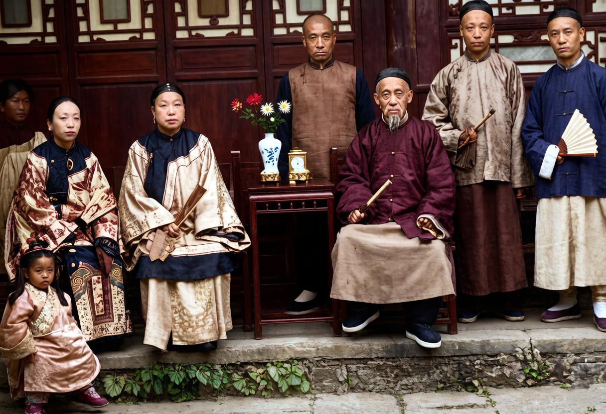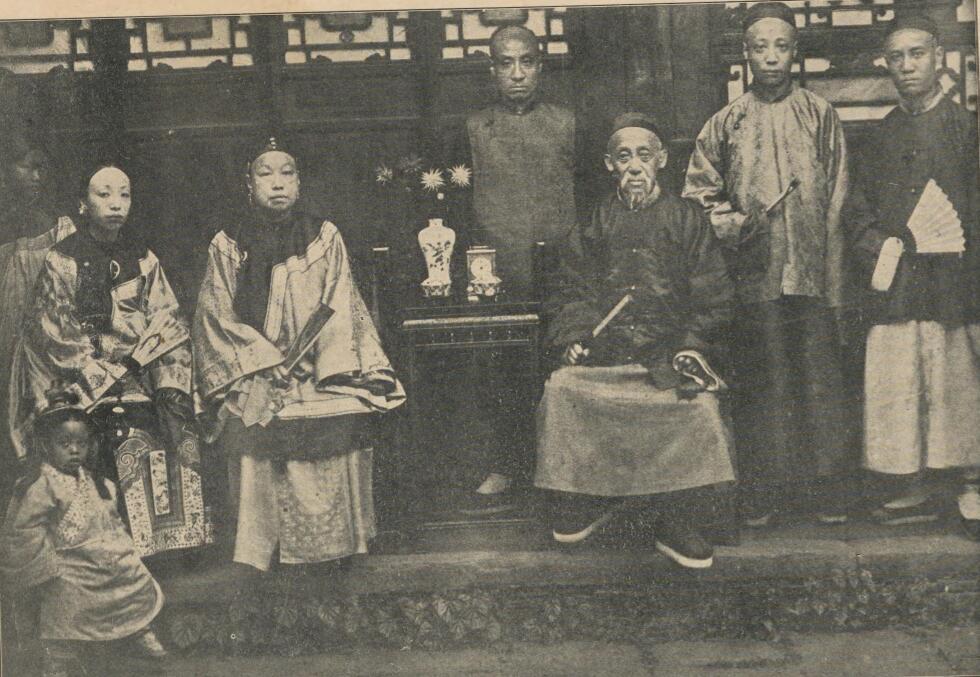 这是一张典型的清末时期富贵人家的合影。 老爷子正襟危坐,一边坐着他的原配和小妾。原配端庄,小妾年轻貌美。站在老爷子身后是三个儿子,可谓人丁兴旺。 最边上的小女孩不知是老爷子的女儿还是孙女。如果是女儿,大抵是庶出。家中的丫头躲在后面的角落里,露出半个身子,若隐若现的感觉。(本图出自坪井正五郎编撰的《1901世界風俗写真帖》)