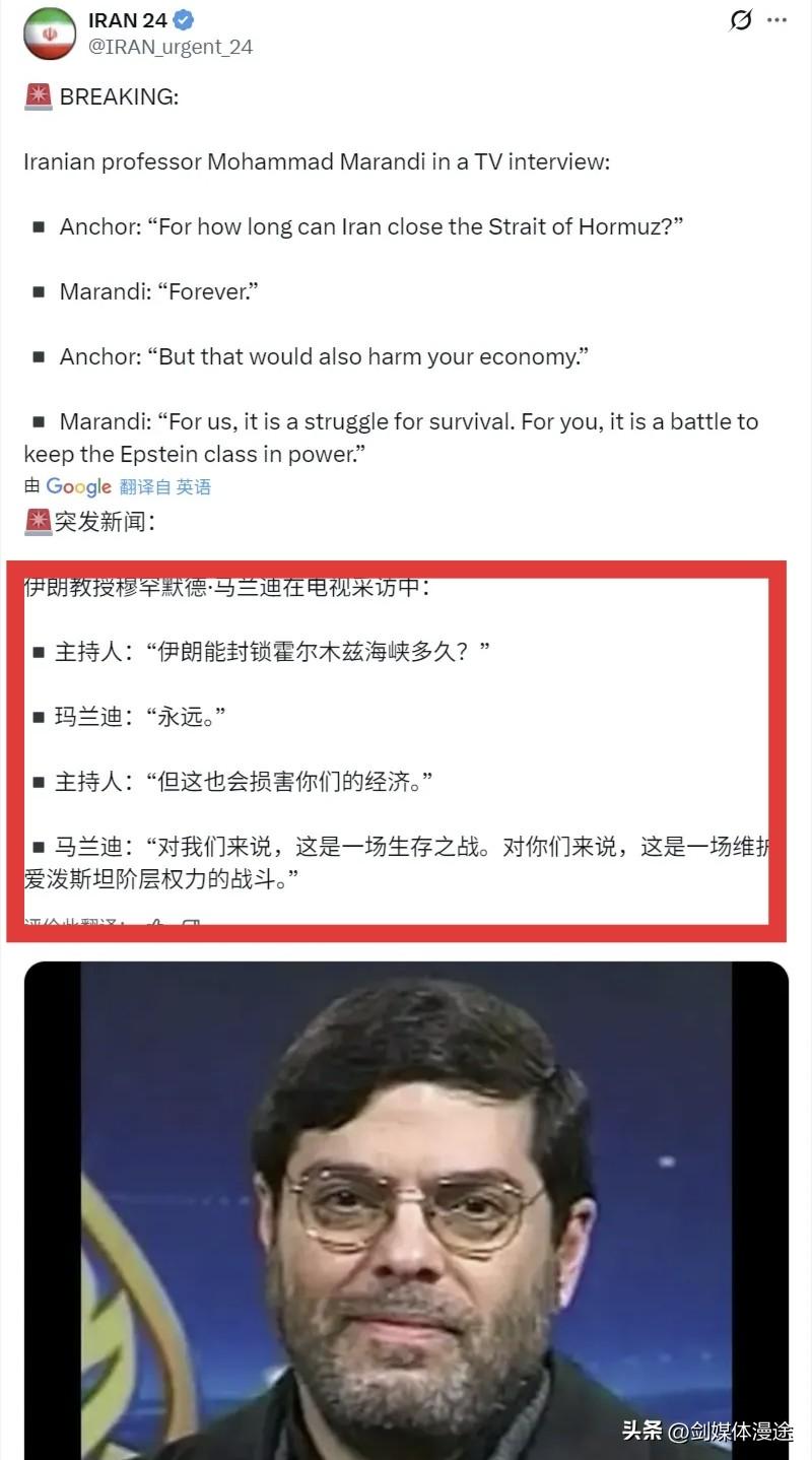 伊朗“硬核”呛声:来吧美军!20多年了我们一直等着你们! 1:伊朗革命卫队司令 阿里.阿克巴尔.艾哈迈迪表示:多年来 我们在等待美国陆军进入指定地点,伊朗二十多年的训练 就等待这么一天到来! 来吧,美军!----这样的话对美军来说是噩梦 太吓人了! 2:伊朗教授马兰迪在电视台采访时表示:伊朗有能力 永久关闭霍尔木兹海峡,再次强调这是“永久”!在这场伊朗的生存之战中,伊朗能做到! 3:至于特朗普对全世界忽悠与伊朗谈判的事,伊朗官员赛义德·贾利利表示,美国要的是推翻伊朗政权,扶持亲美政权,而特朗普所谓的“谈判”只不过就是幌子罢了,而实事也证明 一边谈判 一边入侵伊朗 这是当下正在发生的事情! 不过从2月28日美国攻打伊朗至今 ,从4小时 到4天 再到4周,而最终美国确想休战5天,甚至休战30天,这足以说明,美国已经失败了,打不赢 但也没脸撤,所以又搬出“谈判幌子”,而另一边美军又在增兵中东。 所以对于伊朗人来说,真的有点“光脚不怕穿鞋的”,都打到这个份上了,伊朗为了生存而战,已经没有退路了,就如伊朗最高领袖军事顾问所说,美伊之间斗争已经47年了,如今是到了一个了断的时候了,也必须做了断,不能再拖了。要不美国败,要不伊朗沉没,就算握手,美国也得重新承诺不再干涉伊朗,不再制裁伊朗,以此了断,否则就是你死我活的战争下去,只到一方败为止! 这也足以表达了当下伊朗人民的团结心,一至对外 共同打击侵略者的坚强决心!