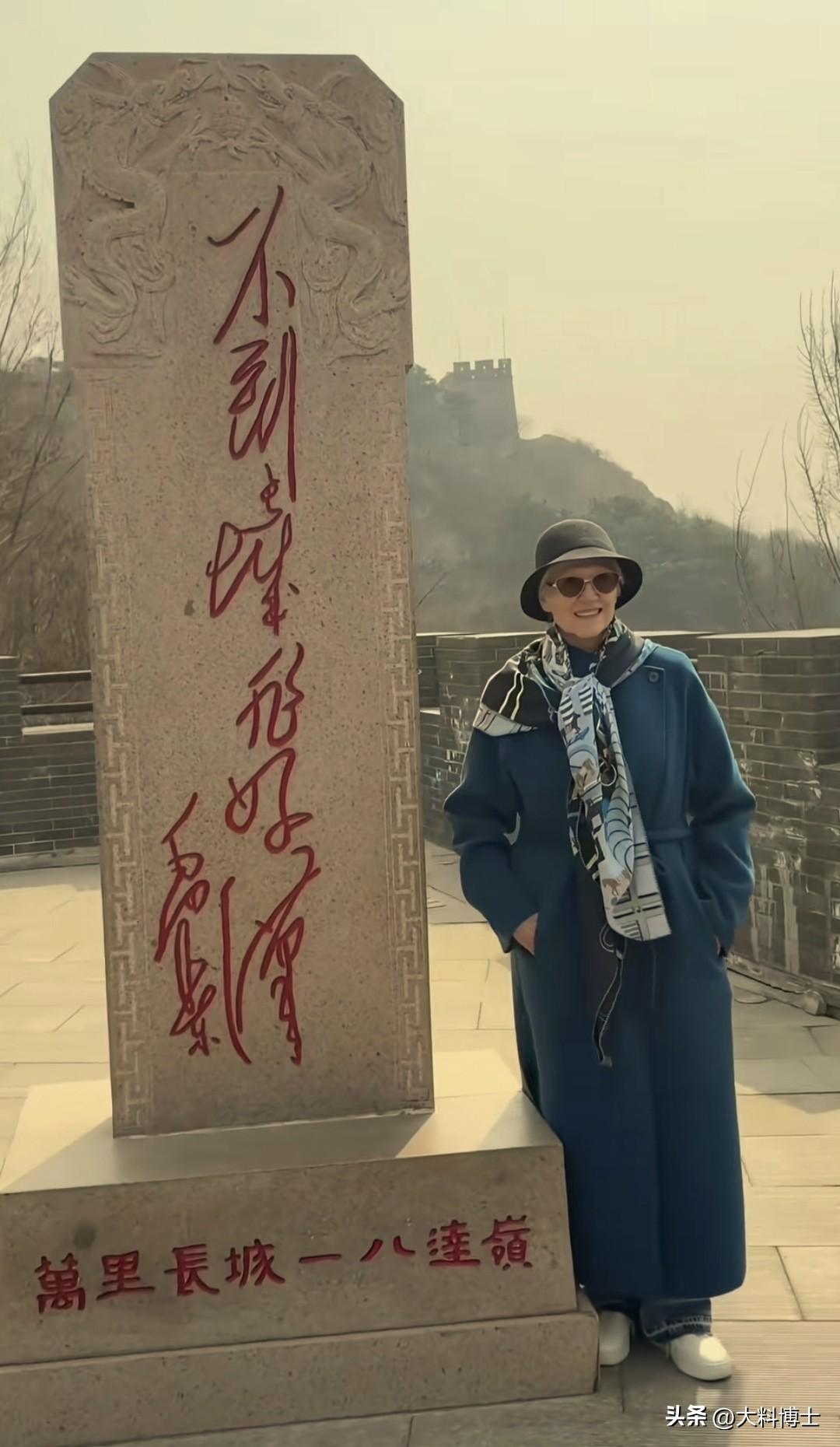 马斯克母亲游览长城,吃中国雪糕!梅耶·马斯克打卡八达岭长城,定居中国热爱文化