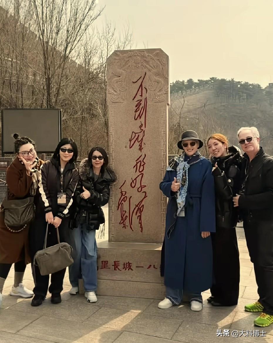 站在“不到长城非好汉”石碑旁,她双手插兜,笑容从容;手持长城造型冰棍时,更是笑容灿烂,尽显松弛活力,丝毫不见岁月痕迹。