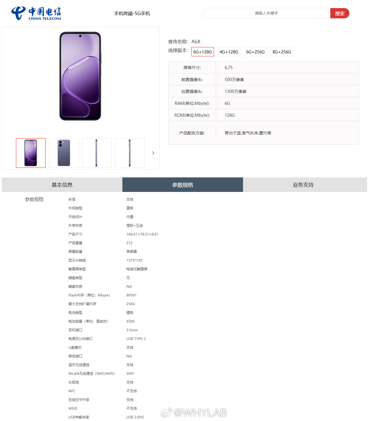 OPPO A6X 上架电信终端产品库,型号 PLT140,6.75 英寸 1570 × 720 挖孔屏,6500mAh 电池,青出于蓝、紫气东来、墨竹黑三款配色,4+128GB、6+128GB、6+256GB、8+256GB 四个存储版本,保留 3.5mm 耳机接口。