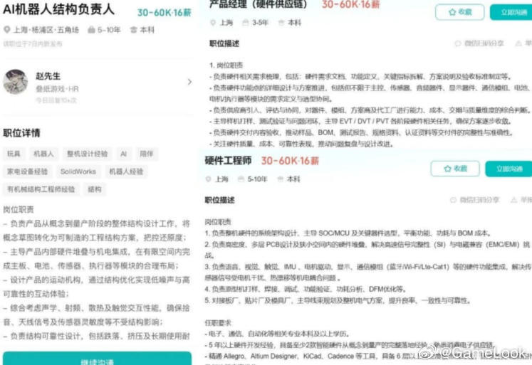 【叠纸招聘“AI机器人研发”,要把纸片人老公带入现实?网页链接】这周有玩家发现,叠纸游戏在招聘平台上发布岗位招募,涉及 AI 机器人结构负责人、硬件工程师、产品经理(硬件供应链方向)等硬件核心岗位。一时间,“叠纸要做AI机器人”的消息在社媒平台引发讨论。