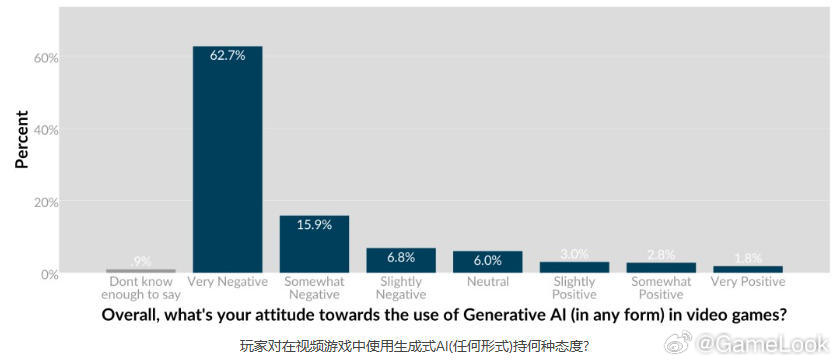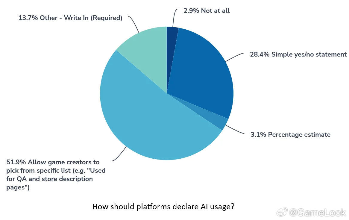 【AI研发游戏“高危”?多数开发者认为“商店应全面披露游戏中AI使用方式”网页链接】最近,外媒GI做的一份调查更是令人对AI技术在海外游戏圈的使用,以及国内游戏出海感到担忧。先说最大的潜在威胁,调查结果显示,绝大多数的海外游戏行业工作者(88.4%)、其中主要是开发者,认为游戏在Steam等数字商店页面上应声明生成式AI的使用。