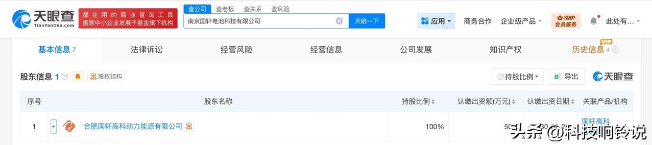 【国轩高科在南京成立电池科技公司 注册资本5000万】 天眼查工商信息显示,近日,南京国轩电池科技有限公司成立,法定代表人为宋金保,注册资本5000万人民币,经营范围包括电池制造、新材料技术研发、汽车零部件及配件制造、电池销售等。股东信息显示,该公司由国轩高科(002074)旗下合肥国轩高科动力能源有限公司全资持股。 天眼查信息: