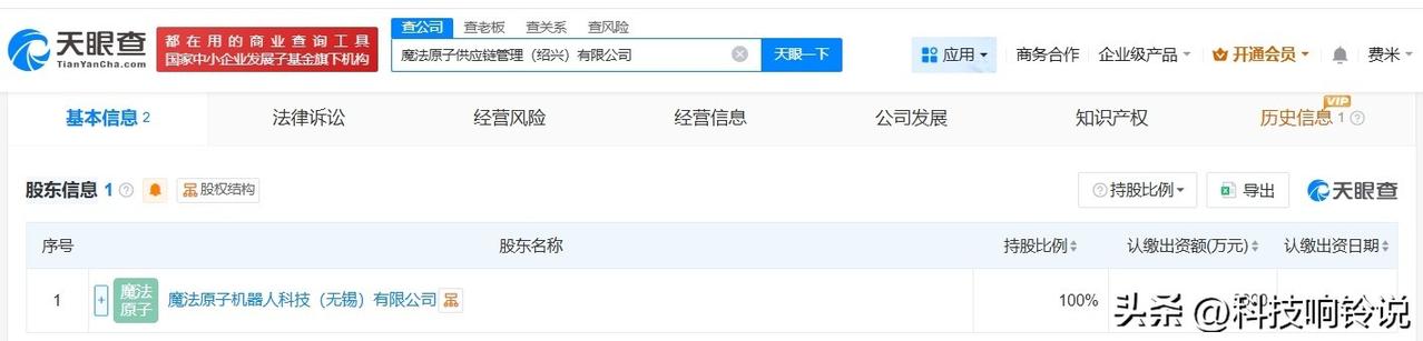 【魔法原子在绍兴成立供应链管理公司 注册资本3000万】 天眼查App显示,近日,魔法原子供应链管理(绍兴)有限公司成立,法定代表人为陈春玉,注册资本3000万人民币,经营范围为供应链管理服务、仓储设备租赁服务、装卸搬运、道路货物运输,由魔法原子机器人科技(无锡)有限公司全资持股。 天眼查信息: