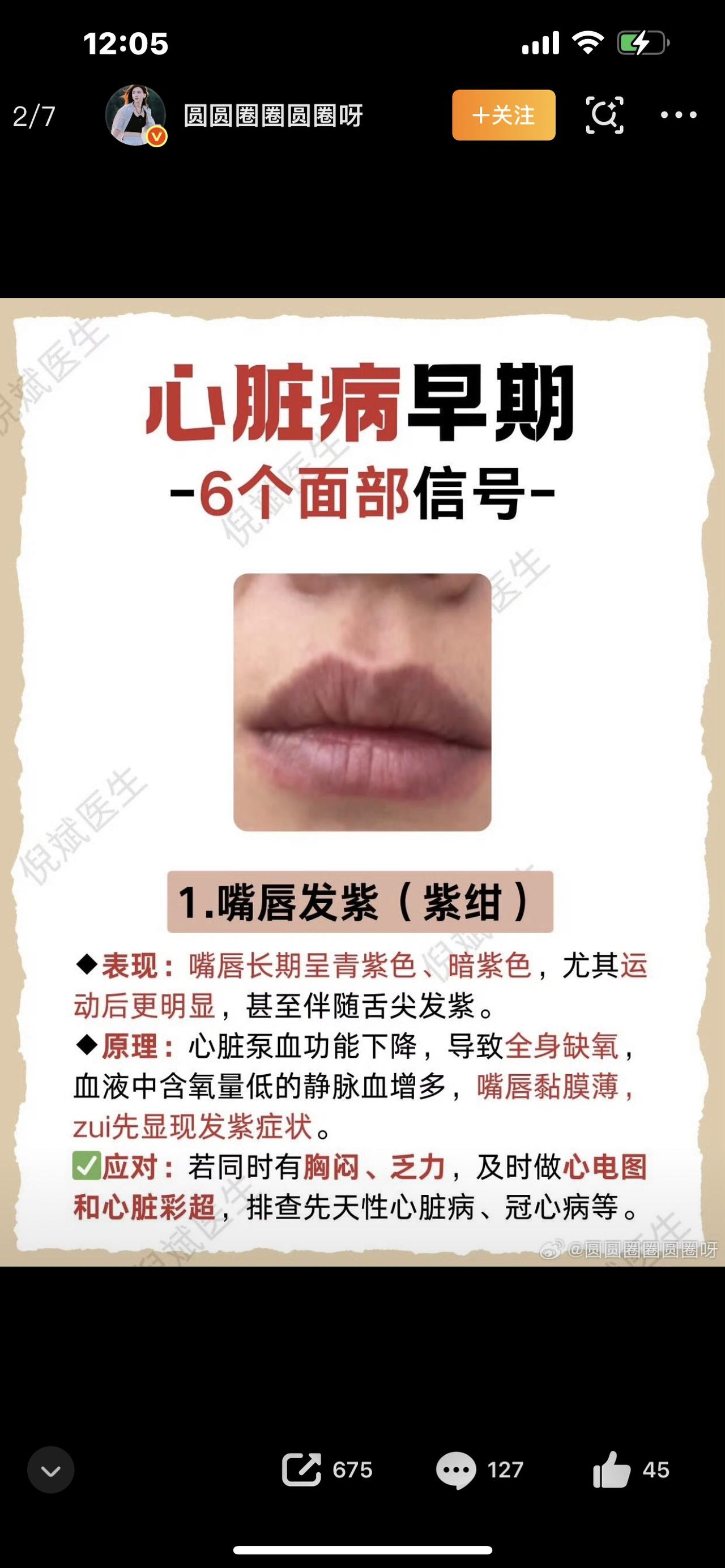 别不当回事!嘴唇发紫,真不是气色不好,可能是心脏在求救! 很多人照镜子发现嘴唇发紫、发黑,还以为只是冻着了、没睡好、肤色偏深,随便涂个口红就遮过去了。 我劝你千万别大意!这可能是身体在向你报警! 正常嘴唇是淡红色、红润有光泽,一旦变成青紫色、暗紫色,医学上叫“发绀”,多半是缺氧、血液循环差,最常见的原因就是:心肺出了问题。 心脏泵血不足、肺部换气不好,血液里氧气不够,嘴唇最先变颜色。尤其是这几类人要高度警惕: • 动不动胸闷、气短、喘不上气 • 稍微一动就累,心慌心悸 • 冬天手脚冰凉,常年暖不热 • 家里有心脏病、高血压病史 有人说:我一直都紫,没事! 转折点来了:天生唇色深没问题,后天慢慢变紫、突然变紫,才最危险! 很多人就是拖到胸痛、晕倒才去医院,那时候已经晚了,小病拖成大病,花钱遭罪还后悔。 除了心脏问题,肺部疾病、贫血、血管问题,也会让嘴唇发紫。别自己瞎猜,也别百度吓自己,最靠谱的做法:及时去医院查一查心电图、血氧、心肺功能。 其实我们总觉得,大病离自己很远。 可身体从不会骗人,那些不起眼的小信号:嘴唇发紫、胸闷、疲劳、失眠,都是在提醒你:别再透支健康了。 钱可以再赚,班可以再加,心脏只有一颗。 少熬一次夜,少生一次气,少扛一点压力,多留意自己和家人的脸色、唇色。 比起发财暴富,平平安安、心脏健康,才是这辈子最大的福气。 转给你最在乎的人,别等疼了才懂得珍惜。玫红色嘴唇 唇周发暗 抹灭红嘴唇 唇褪黑 上嘴唇变厚