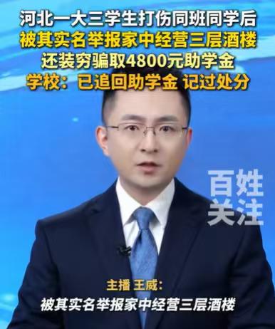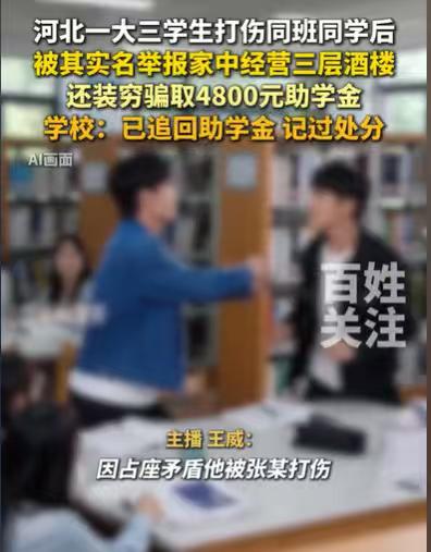“家中3层酒楼,还穷得要学校资助!”河北,大三学生因为占座的矛盾,将自己的同学给打伤了,本以为,他被行政处罚,罚款500元就了事,结果同学捅出了他的一个大秘密,让他到手的4800元助学金,被学校收回了。 这个被打的同学就是申同学,被退回4800元助学金的这个同学就是张同学。 两人的矛盾仅仅只是因为占座引起的冲突。 当时他们谁也不服谁,也不知道到底是谁先占座的,反正都是年轻气盛的大学生,他们三言不合,就吵了起来。 张同学比较的盛气凌人,举起拳头,就将申同学给打伤了。 在这个事件中,张同学比较嚣张,一副得理不饶人的样子,动手先打人,他自然受到了行政处罚,被罚款了500元。 这件事发生之后,事情并没有因为张同学被处罚了就结束了。 申同学被打了之后,身体受到了很大的伤害,现在还休学在家养伤。 因为身体受伤,他已经花了8万多元的医药费,他家不过是普通的家庭,就因为占座引起矛盾,被同学打成这样,申同学面对家人的担忧,面对身体的糟糕,学业的耽误,他在家里也是心急如焚,更是不甘心。 发生这样的事,不管是谁先挑起事端的,他当时没有伤到张同学半分,张同学因为脾气暴躁,将他给打伤了,张同学就应当为此事承担责任。 可事情发生之后,张同学始终没有向他道歉,更没有向他赔偿。 如果这个张同学真如他所说那样,是个贫困生,家中没有钱,申同学也不想追究这么多。 其实却并非如此。 一开始的时候申同学也是听同学说的,当这个张同学虚构家庭贫困,成功获得学校的4800元助学金。 这件事的背后,已经有同学在纷纷议论,说张同学家中有3层酒楼,又没有倒闭,家中不可能穷得要学校的助学金。 当时大家都是听说而已,都没有证据,大家都是成年人,没有证据的事情,谁也不敢举报,只是背后讨论而已。 如今申同学休学在家,身上的伤还没有好,他还不能回到学校,学习知识。 他将所听到的消息都放在心上,为了证实这些事情是真的,申同学便去查证这件事情,果然发现,张同学家是有3层酒楼的,生意还不错。 家中能够经营3层酒楼,还要申请助学金,奇怪的是他还申请上了,这足以证明张同学的手段不简单。 申同学抓住了张同学的把柄,他决定为自己讨一个公道,既然张同学不懂得道歉,不懂得要为这件事承担责任,他只能让张同学为自己的行为付出代价。 申同学举报了张同学,学校经过核查此事,发现事实属实,于是撤回了助学金,并且对张同学进行记过处分。 这仅仅只是让张同学为自己的欺骗行为,付出了代价而已,申同学被张同学殴打,申同学所受的伤,所付出的医药费,依然还没有一个说法。 申同学只能下定决心,起诉张同学,要他赔偿。 发生这样的事情,申同学该怎么办呢? 首先,张同学是大三学生,已经是成年人,他殴打同学这行为已经构成故意伤害他人的行为。 《治安管理处罚法》第43条规定:殴打他人的,或者故意伤害他人身体的,处五日以上十日以下拘留,并处二百元以上五百元以下罚款;情节较轻的,处五日以下拘留或者五百元以下罚款。 如果张同学受的伤是轻微伤,那么张同学只是受到行政处罚,罚款500元,这不为过。 但是如果申同学受的伤是轻伤以上,那么张同学将有可能受到刑事处罚,他的行为将有可能会构成故意伤害罪。 其次,申同学因为张同学的殴打而身体受伤,他可以要求人身损害赔偿。 《民法典》第1179条规定:侵害他人造成人身损害的,应当赔偿医疗费,护理费,交通费,营养费,住院伙食补助费等为治疗和康复支出的合理费用,以及因误工减少的收入。造成残疾的,还应当赔偿辅助器具费和残疾赔偿金;造成死亡的,还应当赔偿丧葬费和死亡赔偿金。 发生这样的事情,男同学因为受伤花了多少钱,张同学就应当赔偿多少钱。 那么你对此事有何看法?