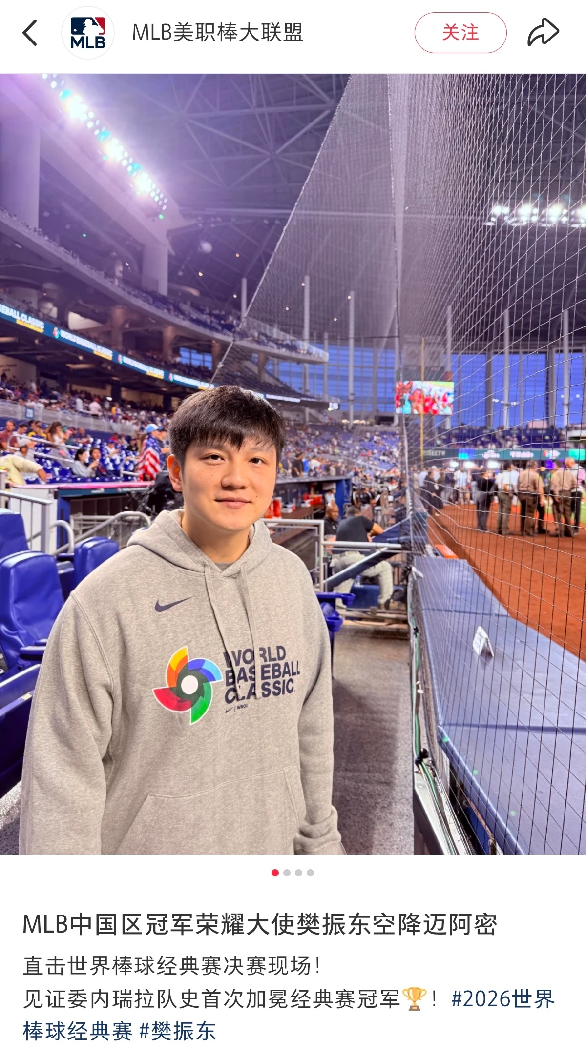 樊振东世界棒球观赛直拍图。期待MLB大联盟放一个冠军荣耀大使樊振东的vlog让我