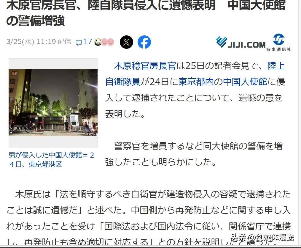 日本至今没有“道歉”仅用“遗憾”就敷衍过去了?还要降级中日关系? 3月25日,日本内阁官房长官木原稔在新闻发布会上,对日本陆上自卫队现役人员24日入侵中国驻如本大使馆一事表示“遗憾”。 然而用外交词令表示:日本将与有关部门配合依国际法与国内法加强对中国使馆的保护 防止再次发生! 一个日本官房长官就这样草草的应对了“一件国际大事”,对日本自卫队带武器闯中国使馆并企图动刀杀人的图谋 一句道歉都没有吗?这就是日本对待中国的态度! 相反 如果这件事发生在美国大使馆,美国军人早已开枪将其毙了 留给日本官方就是等待收尸而已。 这也只能说中国的态度还是“软”,外国的网友对此也表示了他们的看法,对日本自卫队员外交挑衅 确实需要严打而不能如此轻放 ,中国确实是克制了! 同时随着日本社会越来越右翼化,日本右翼分子的不断挑衅之下,日本对待中国的态度并导弹中日关系不断下滑,在这种情部之下,日本政府还企图降低中日关系的层阶,这对于日本右翼分子挑衅中国的趋势一定不会权有这一次。 所以中国必须出重手要求日本政府道歉并做出承诺,否则一边是日本右翼把挑衅中国当作爱国秀,而中国又克制,这会让日本右翼势力看到一个“软弱”的中国而变得更回的狂妄而嚣张。 而事实上,日本自卫队一刻没停,正在大规模的改编自卫队的力量,当地时间3月23日,日本海上自卫队进行了自成立以来最大规模的编制体制调整改革:全维度、进攻导向的战力重构。将海上自卫队整编成统一指挥的水上舰队,重点强化西南诸岛部署。将航空自卫队加速向航空宇宙自卫队转型,大幅扩编太空部队。 日本还计划采购400枚射程达1500公里的“战斧”式巡航导弹,12式改进型导弹射程延伸至1000公里,可以覆盖周边国家沿海核心区域。 所以日本政府在对待中国的态度上,一方面他们不再“友好”,一方面正在备战,同时降级中日关系,看起来“真的有一仗 ”将要发生?日本“先下手为强”?