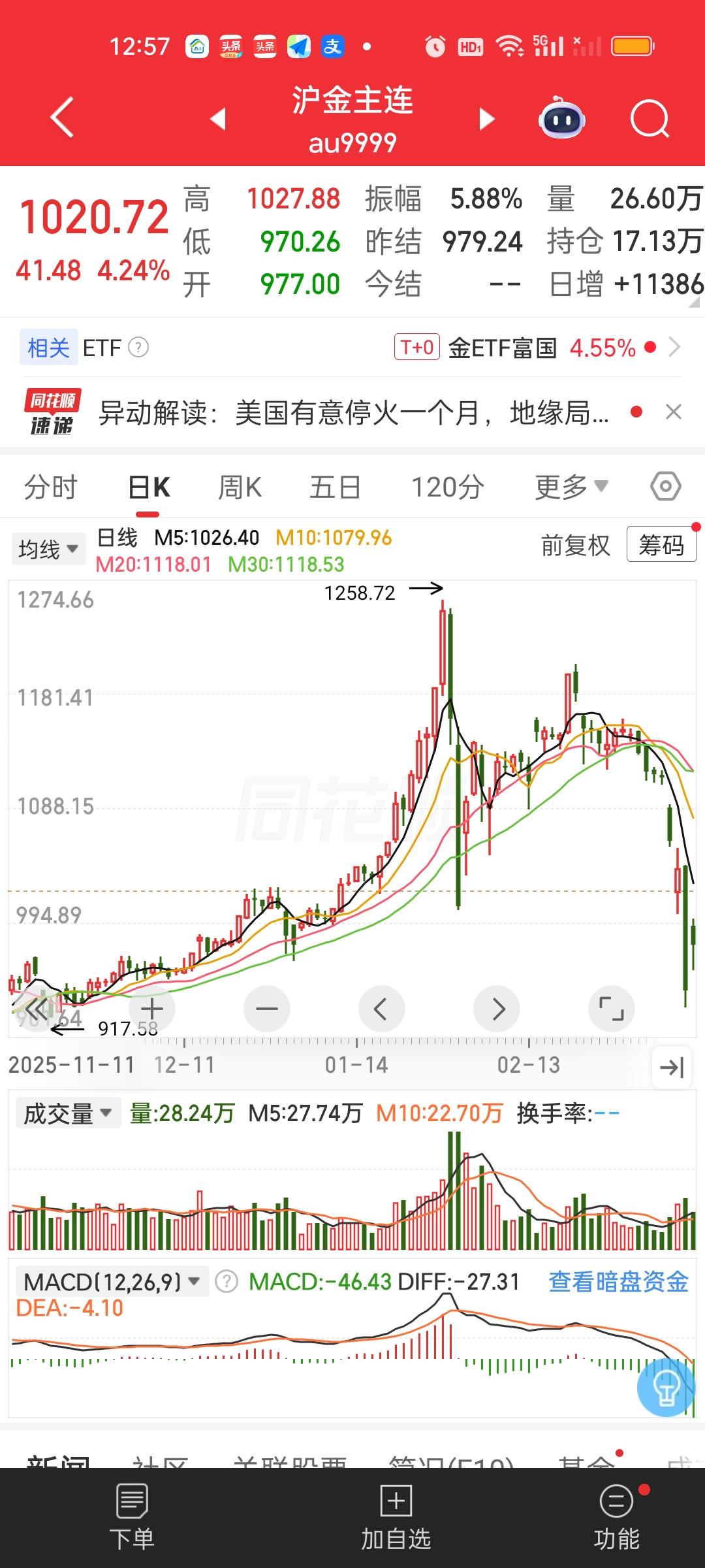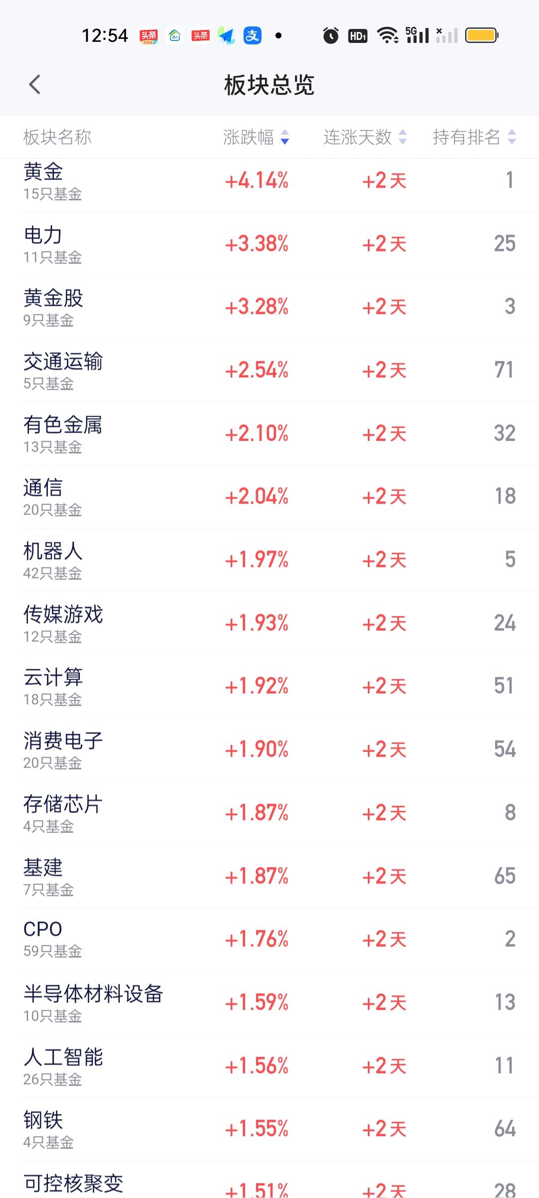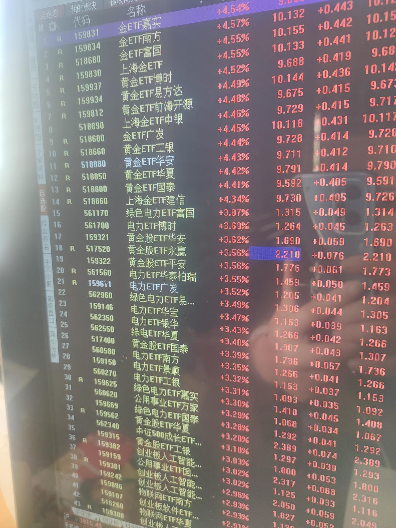 从板块涨幅来看,今天早上涨最多的还是黄金和电力。从场内ETF的涨幅来看也是这两个板块。涨幅可以说一骑绝尘。这两个板块的涨幅接近4%,而其它上涨的板块涨幅几乎都在2%以内。看来黄金连续暴跌,这是砸出来黄金坑来了,名副其实的黄金坑。而电力因为石油暴涨,电力短缺,用电压力巨大,涨价也会提上日程。所以电力也算冲突受益板块。跌幅方面,今天下跌的板块很少。