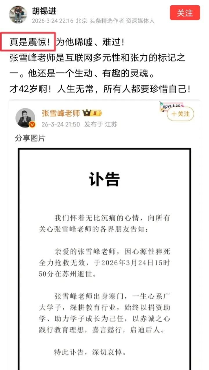 这几天胡锡进屡屡表示“震惊”,什么事情让见多识广的老胡如此震惊呢? 一个日本兵强闯我大使馆,胡锡进表示“震惊”。张雪峰因故去世,胡锡进也表示“震惊”。凡是突然发生的意外之事,老胡都是“震惊”。 可是日本兵的歹行和张雪峰的去世没法相提并论。对于日本兵的歹行,胡锡进除了“震惊”以外就没有其他话了,既没谴责也没批判。反倒是张雪峰的去世,老胡额外表示了“唏嘘、难过”。 那么胡锡进对日本兵的歹行如此惜墨如金,老胡除了感到意外,就没有其他能说的话吗?