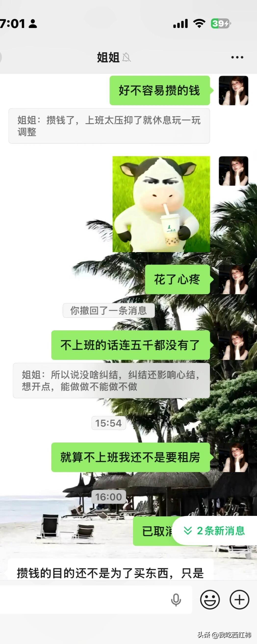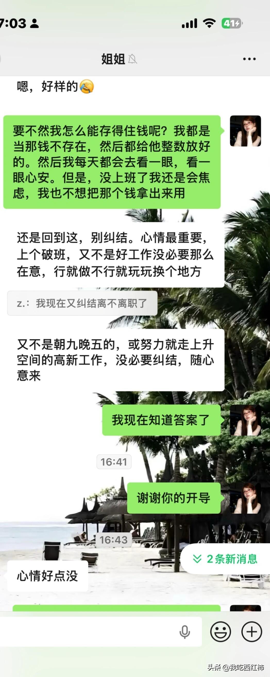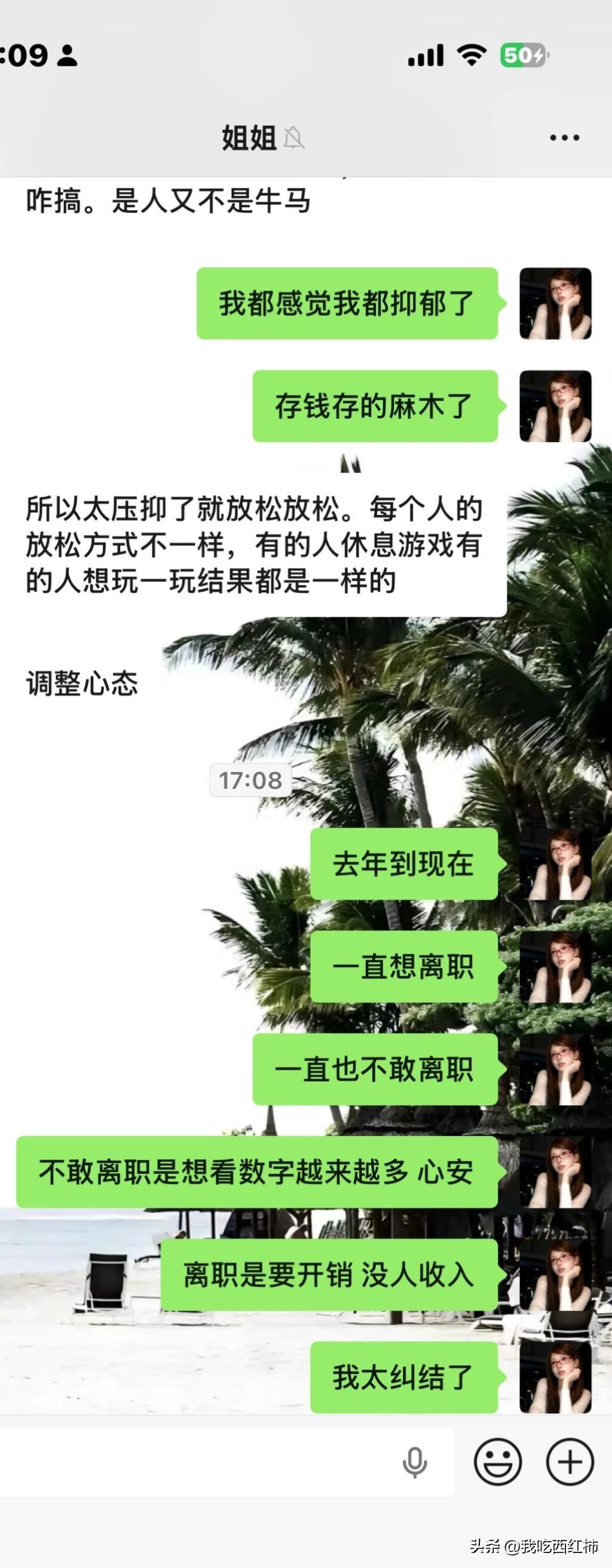 求求大家给我个建议吧 真的好累啊 出社会上班7年了一直当牛马 虽然中间也换过几次工作 都是骑驴找马 没有间隙 这个工作上了三年了今年第四年去年一直想离职 但是也不敢离职 不知道攒钱的人是不是跟我一样的舍不得花 花了就很愧疚 真的攒钱攒魔怔了 因为我一直想攒钱买房 舍不得花 上班真的太压抑了 我的工作早九晚九 上12个小时 工资平均5500-6000左右 一个月四天休息 现在今年改革了工资变低了 想离职 但是又害怕离职找不到工作 因为到处都是大环境不好 找不到工作 身边声音太多了 我看不清 想找你们帮我支支招