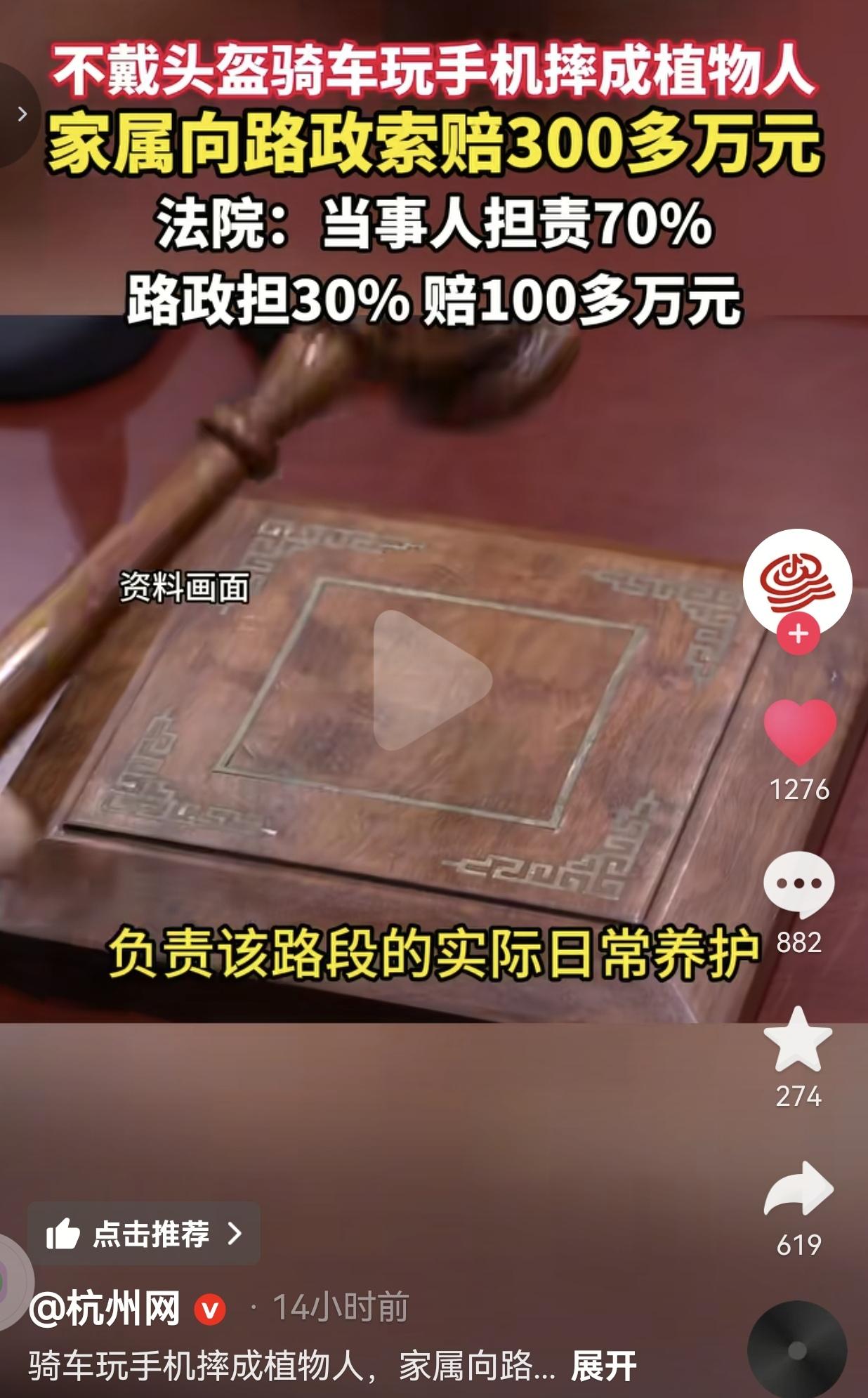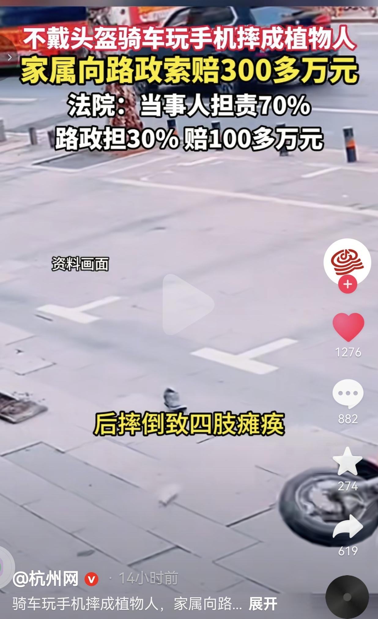 不戴头盔骑车玩手机摔成植物人,家属索赔300万,法院判路政赔100万?这判决我看傻了! 2023年10月,北京房山的孟某,骑着电动自行车,不戴头盔就算了,还一边骑车一边低头刷手机,眼睛都黏在屏幕上,完全不管路! 行到一段路时,直接撞上了路边翘起的排水沟盖板——那盖板早就翘起来了,路政却一直未及时处理安全隐患,就这么明晃晃地摆在路边。 孟某连人带车飞出去,脑袋重重砸在地上,当场就没了意识。 送到医院后,人直接成了植物人,四肢瘫痪,连话都不会说,彻底失去了自主行动能力。好好一个家,瞬间被拖进深渊。 可谁能想到,家属不去反思孟某自己的作死行为,反而把负责路段养护的路政公司告上了法庭,张口就要300多万赔偿,理由是“排水沟盖板没盖好,才导致我家亲人摔倒”! 法院审理后,给出了判决:孟某自身妨碍安全驾驶的行为是事故主因,担70%责任;路政未及时处理安全隐患,存在过错,承担30%责任,赔付孟某100余万元 。 网友看到后评论说:“笑不活了!自己走路看手机摔一跤,是不是还要告地球引力太大?头盔不戴,手机不离手,这不是骑车,这是拿命赌运气!现在赌输了,想找个冤大头接盘?” 也有的网友说:“我天天在路上跑,最恨这种骑车玩手机的!自己不要命别连累别人!路政也是倒了八辈子霉,路上有个坑就得背锅?那以后谁还敢管路?” 还有的网友说:“心疼是真的,毕竟成了植物人,一家子都毁了。但心疼归心疼,道理不能歪!要是这都能赔,以后谁还遵守交通规则?反正出事了找路政就行!” 我真的憋不住想说两句!孟某这行为,简直是把“作死”两个字刻在了脑门上!不戴头盔,等于把最脆弱的脑袋直接暴露在危险里;骑车玩手机,等于主动蒙住了自己的眼睛,把方向盘交给了运气。这俩buff叠满,不出事才怪! 路政确实有养护不到位的地方,排水沟盖板翘起来是事实,没及时处理就是失职,担30%责任也算说得过去。 但70%的锅,必须牢牢扣在孟某自己头上!这不是天灾,是人祸!是他自己亲手把自己和家人推进了地狱! 最让我膈应的是家属的态度——出了事不想着吸取教训,反而想着怎么转嫁责任。300万的狮子大开口,本质上就是想把自己的过错,转嫁给全社会来买单。如果这种逻辑都能成立,那以后谁还敢认真走路、认真骑车?反正只要出事,总能找到个“背锅侠”。 这件事最讽刺的地方在于:我们总在为别人的错误买单,却很少为自己的侥幸付出代价。 头盔戴与不戴,手机看与不看,从来都不是小事,那是生与死的选择题。孟某用自己的一生,给所有人上了最惨烈的一课:你可以轻视规则,但你永远赌不起命运。 最后我想说的是: 别让手机里的几秒快乐,变成病床上的一生悔恨;别让侥幸的一次违规,毁掉一整个家的明天!