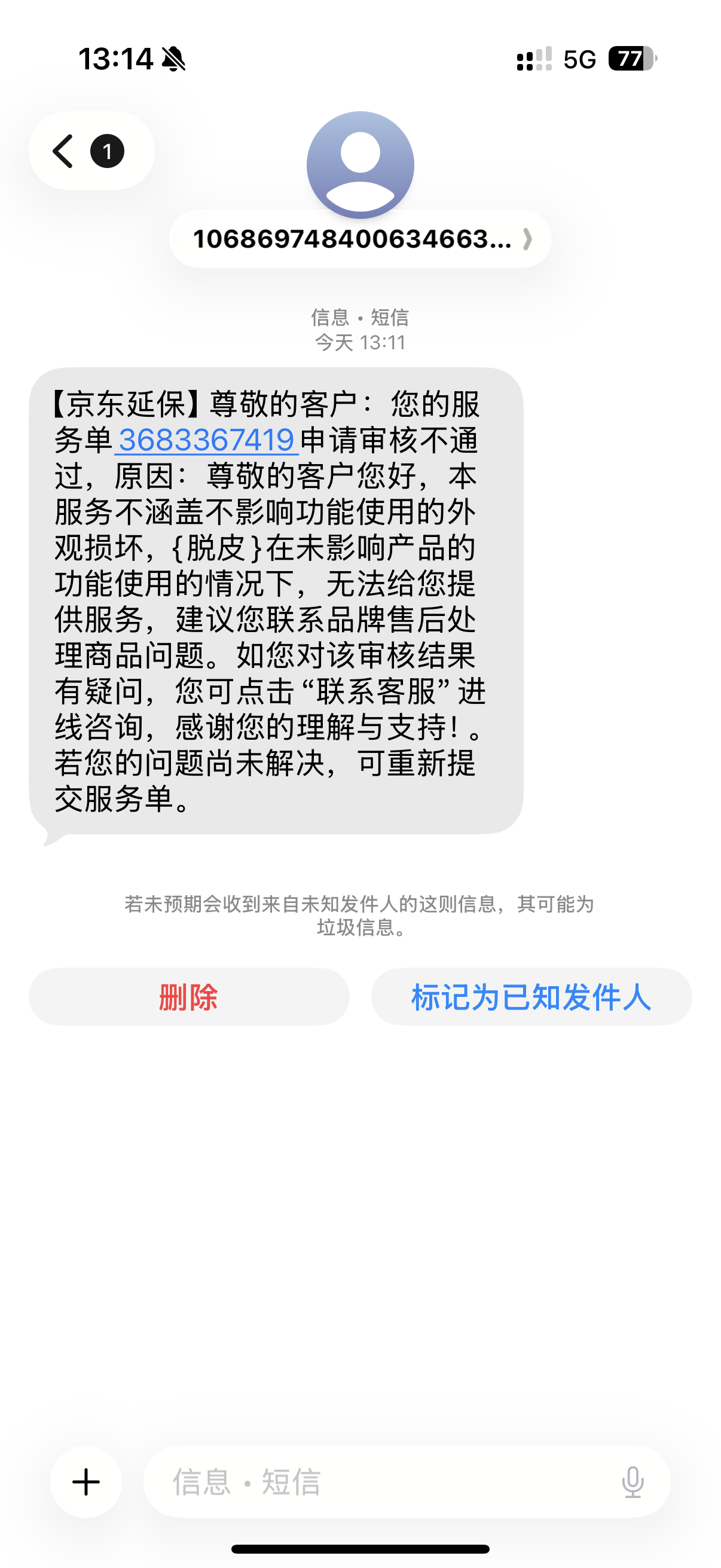结果给我拒了,理由是 外观损坏,又不是不能用,要功能性损坏才行。