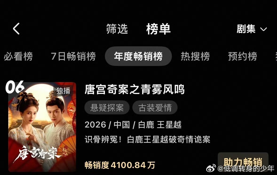 白鹿王星越 《唐宫奇案》灯塔播放量集均3132万昨天生命树1300➕热搜说是长剧