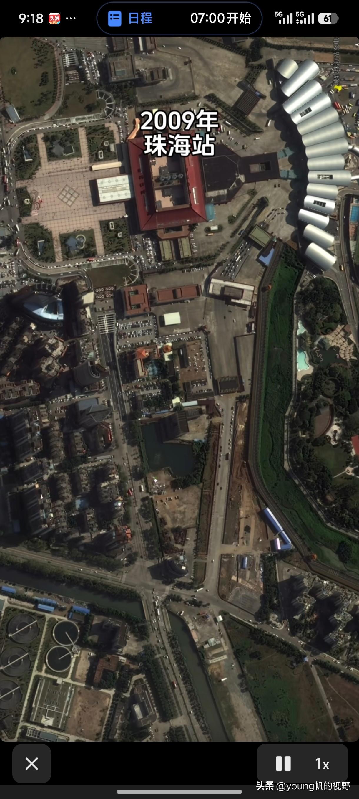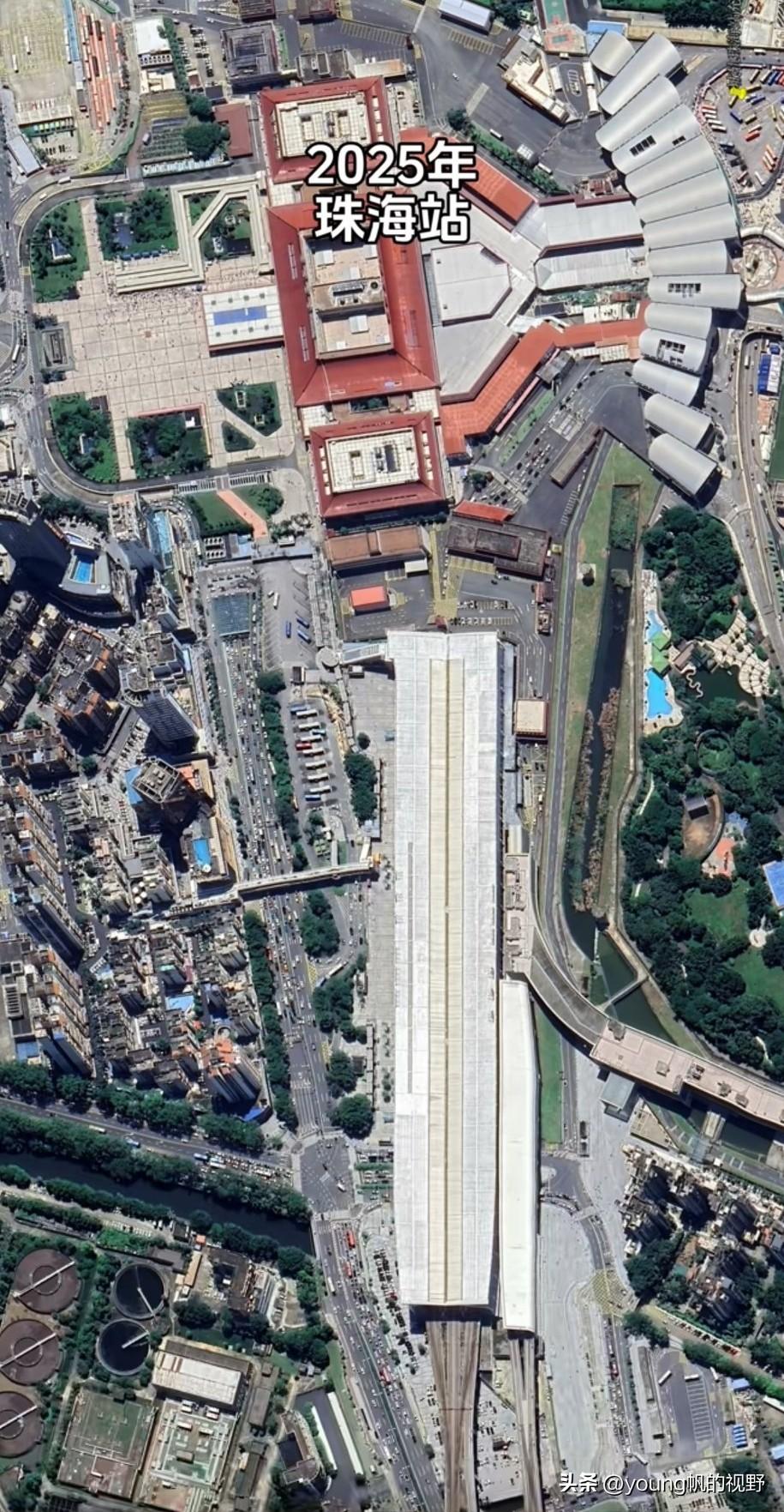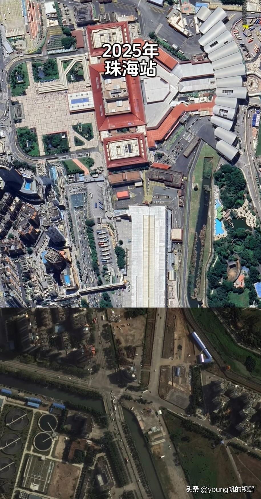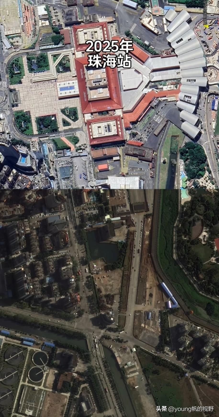 2009年-2025年,珠海拱北口岸周边变化对比。从卫星照片来看,2009年时,拱北口岸周围还是有不少的空地。26年的时间里,变化最大的就是在拱北口岸旁边新建的珠海火车站。车站的竣工,让珠海也一步到位实现了高速铁路通车,人们去珠海和澳门也更为快捷了。