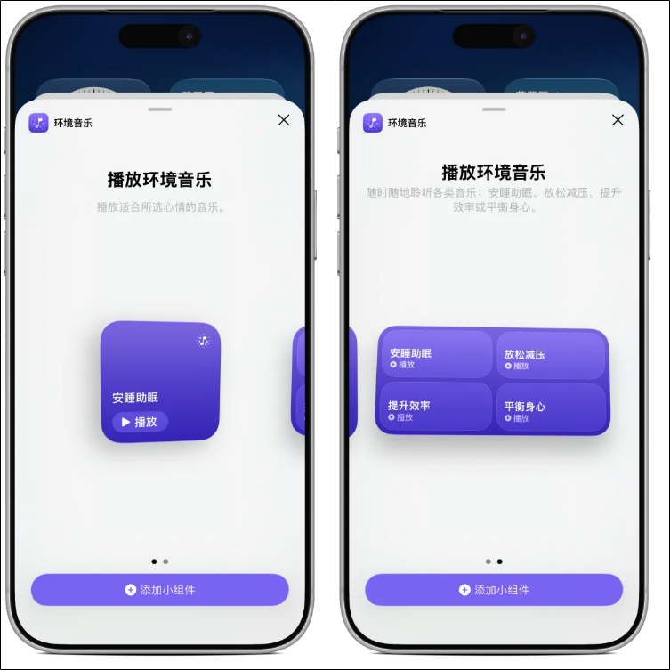 安睡助眠、放松减压、提升效率和平衡身心环境音乐小组件为主屏幕带来了精选播放列表,并为专辑和播放列表提供全屏沉浸式背景显示。