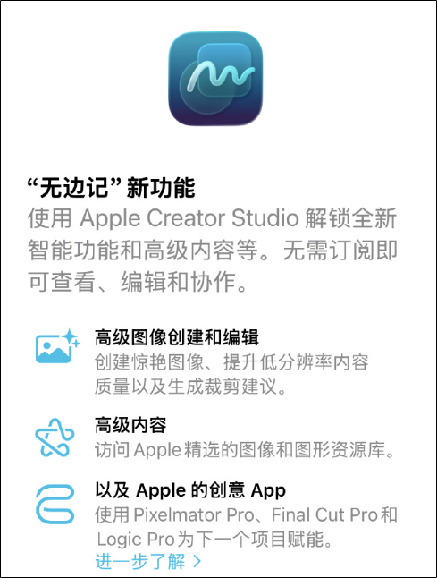 “无边记”图标进行了重新设计,应用引入AppleCreatorStudio,带来更强的图像创作与编辑能力;从快速工具栏或通过按住将提醒事项标记为紧急,并在智能列表中过滤紧急提醒事项。