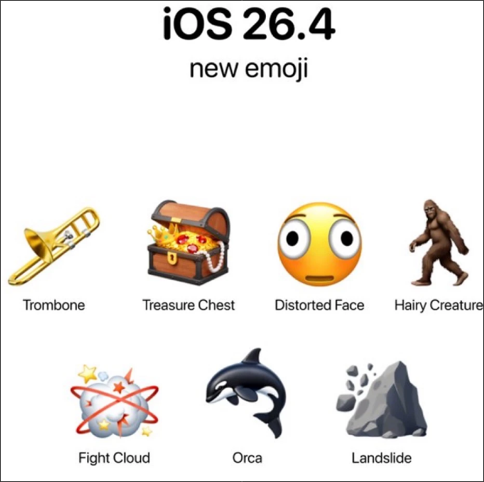 iOS26.4正式版为丰富用户的日常沟通,在此次更新中新增了8个全新Emoji表情,其中包括虎鲸、长号、山体滑坡、芭蕾舞者以及扭曲的人脸。