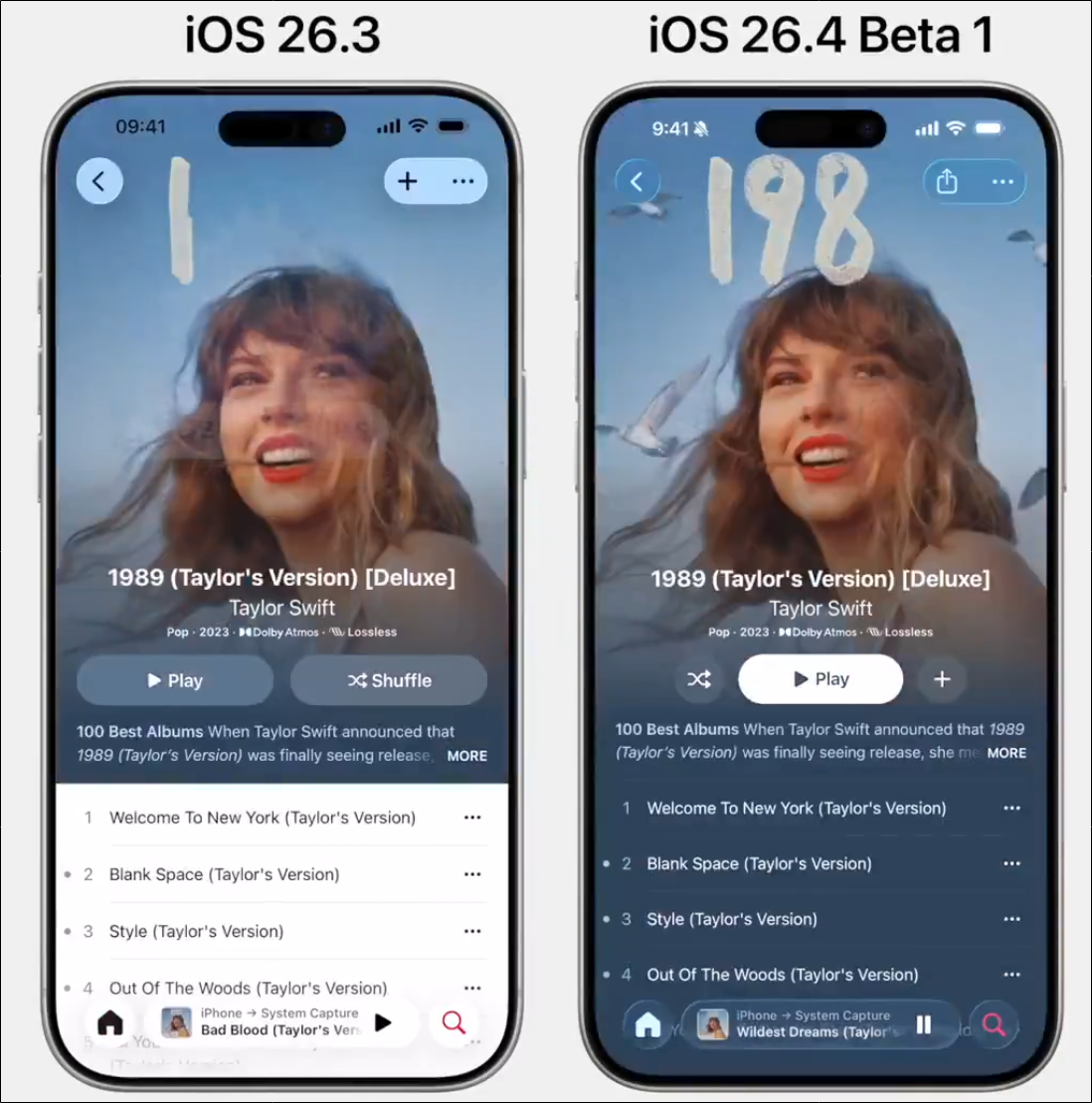 AppleMusic本次有多项界面及功能更新,如查看专辑或歌单时,背景会根据封面自动适配,用起来会更具沉浸感。
