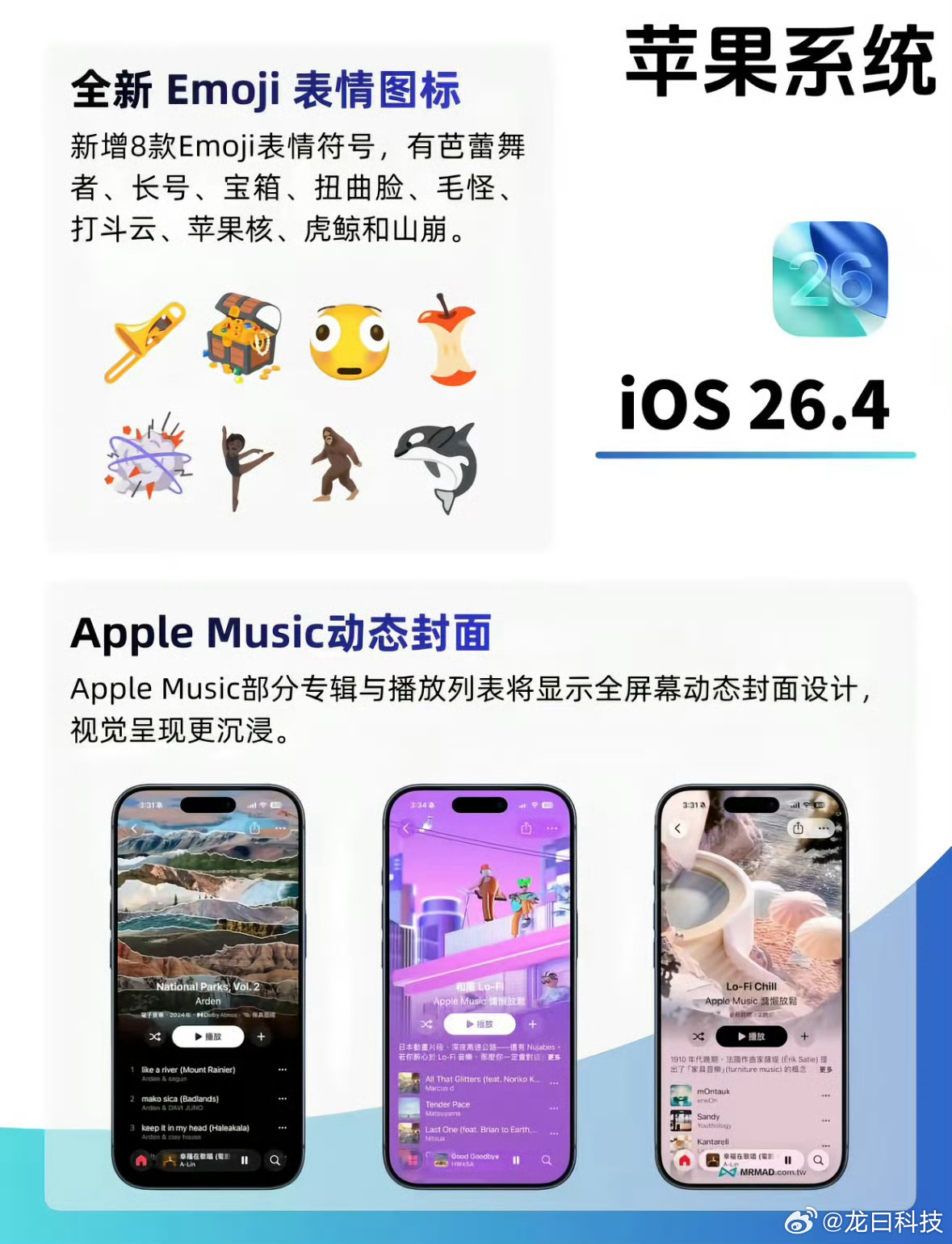 iPhone大量新功能上线苹果推送了iOS 26.4正式版,新功能确实不少。Apple Music现在能让你直接输句话,AI就帮你生成歌单,还能离线识曲,没网也能听歌识曲,有网了再给结果。家人共享终于能各付各的了,成年人不用再绑组织者的卡。键盘打字错字漏字的问题也修了,输入更准。还加了虎鲸、扭曲脸、芭蕾舞者这些新表情。不过AI版Siri这次没来,还得再等等。