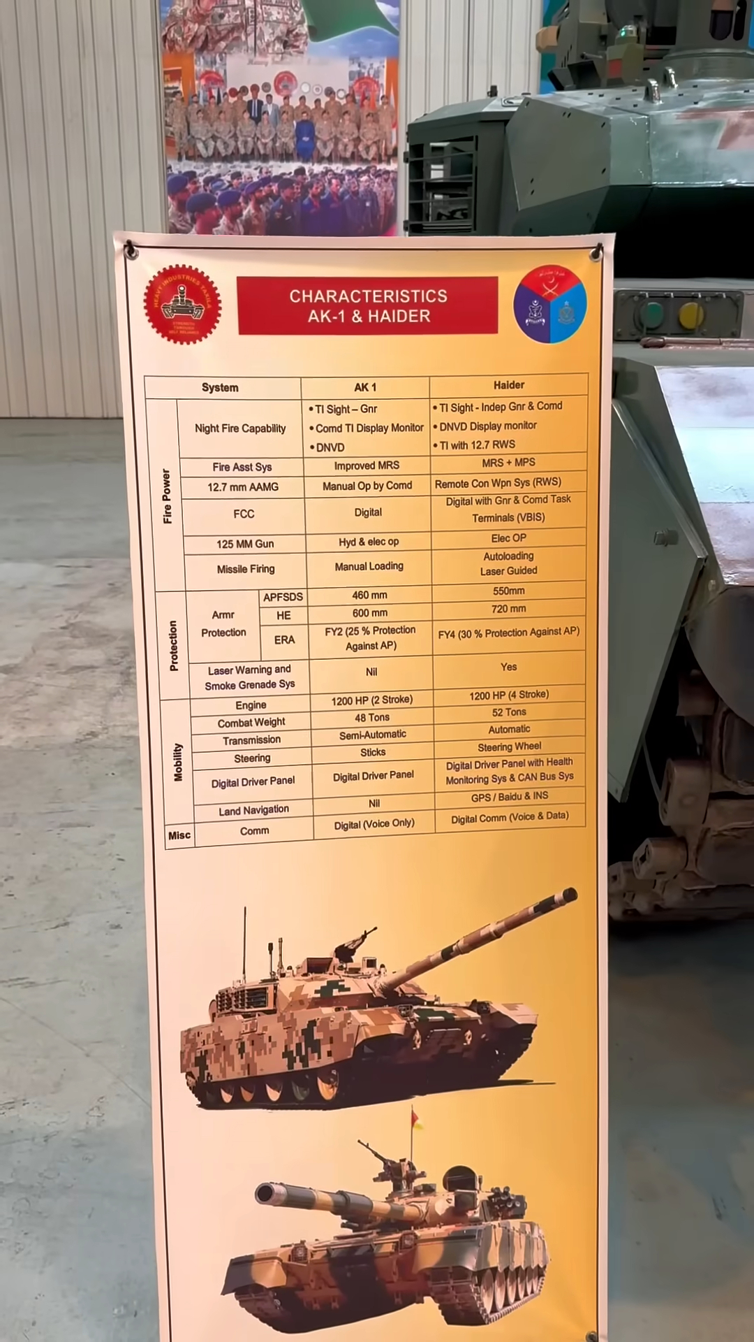 巴基斯坦人参观塔克西拉重工(HIT)的内部展馆,展板附上了关于“哈立德-1”(AK-1)与“海德尔”(巴基斯坦VT4A)的数据对比,其中介绍了两者的防护水平,指标分别为460KE/600CE与550KE/720CE。