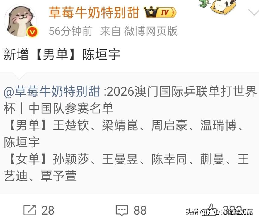 陈垣宇递补参赛,国乒开始重用小将了。 昨天林诗栋退赛,都以为向鹏能递补,今天陈垣宇获得递补参照资格,还是没有让向鹏参赛。 国乒开始重视梯队建设了,澳门世界杯不仅有小将温瑞博,而且林诗栋退赛,又派出同龄小将陈垣宇。 陈垣宇近期表现挺好,能拿下雨果,输小莫比分也不难看。 陈垣宇和蒯曼混双也应该重点培养,洛奥周期必须让小将多打比赛,小将能打出来国乒才有未来。 图片来自网络侵权可删。