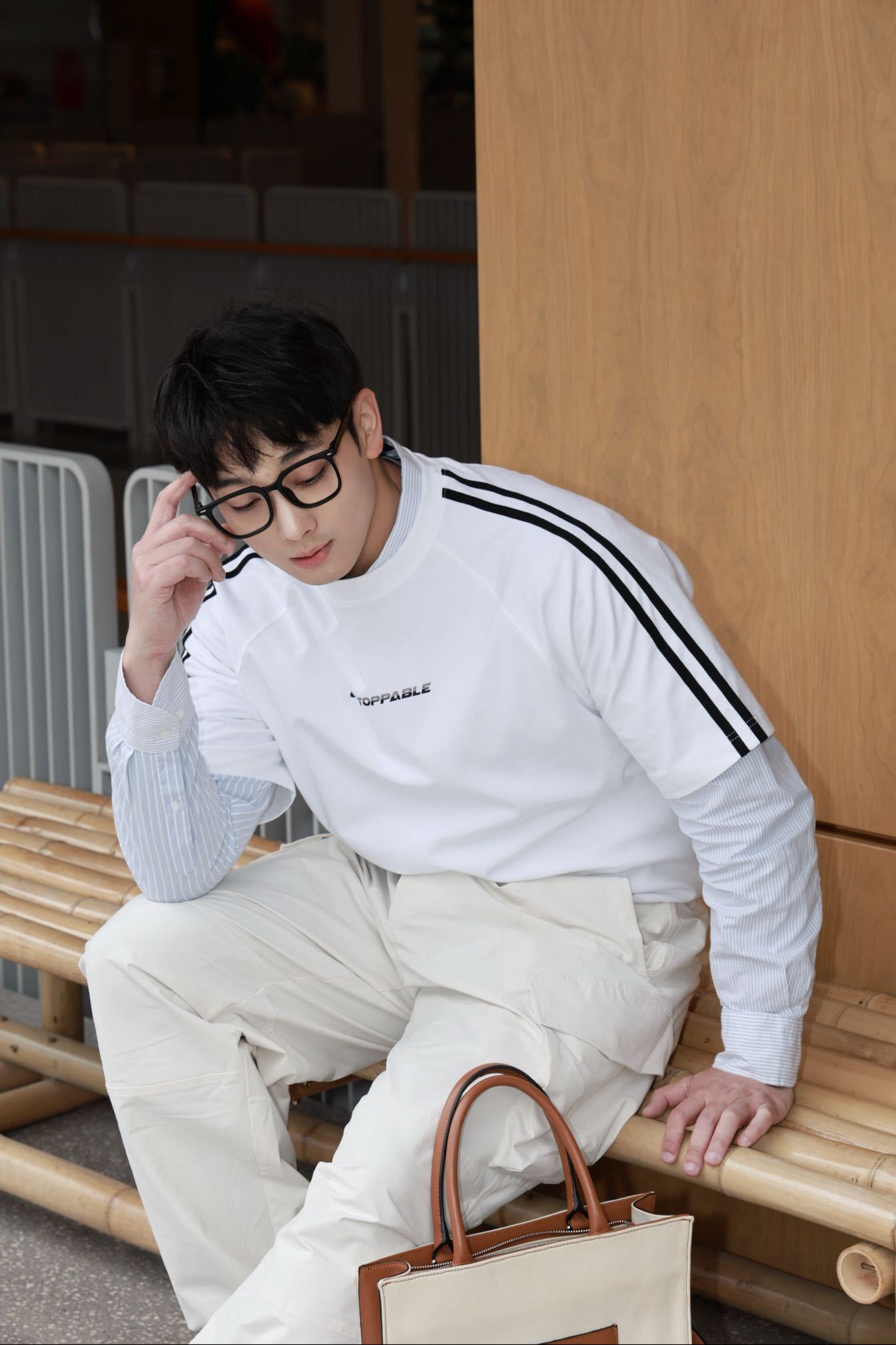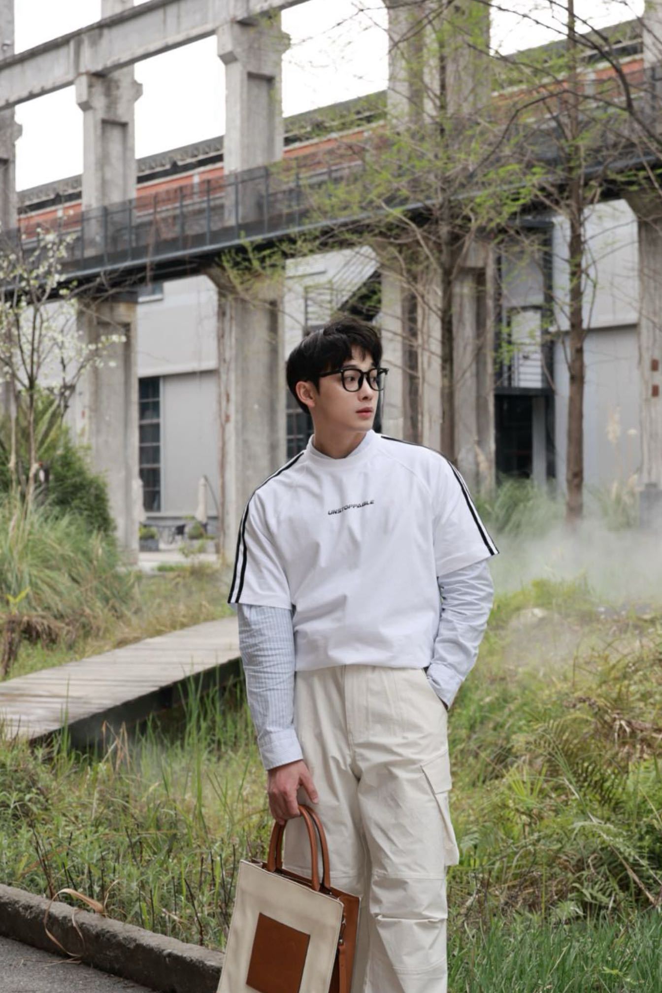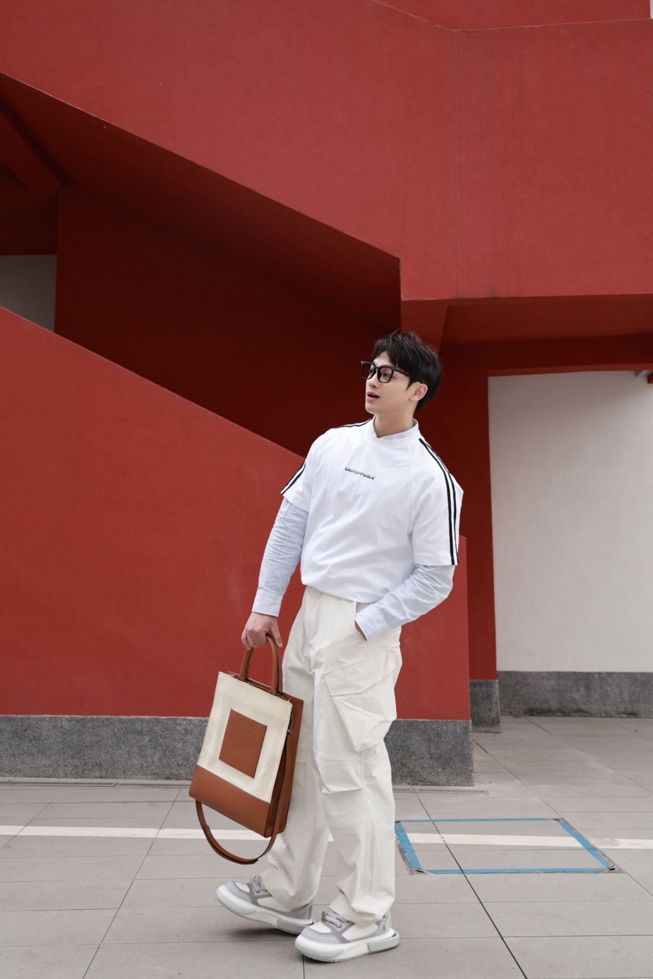 站在成都街头的红墙转角或是老厂房的水泥柱旁,一身米白色系特别出片。这件以纯自带侧边撞色织带,简约中透着运动活力,内搭浅蓝条纹长袖,完美应对成都春日“早晚冷、中午晒”的温差魔法。搭配米白工装裤与灰拼色鞋子,少年感拉满,走在街头就是松弛范儿。