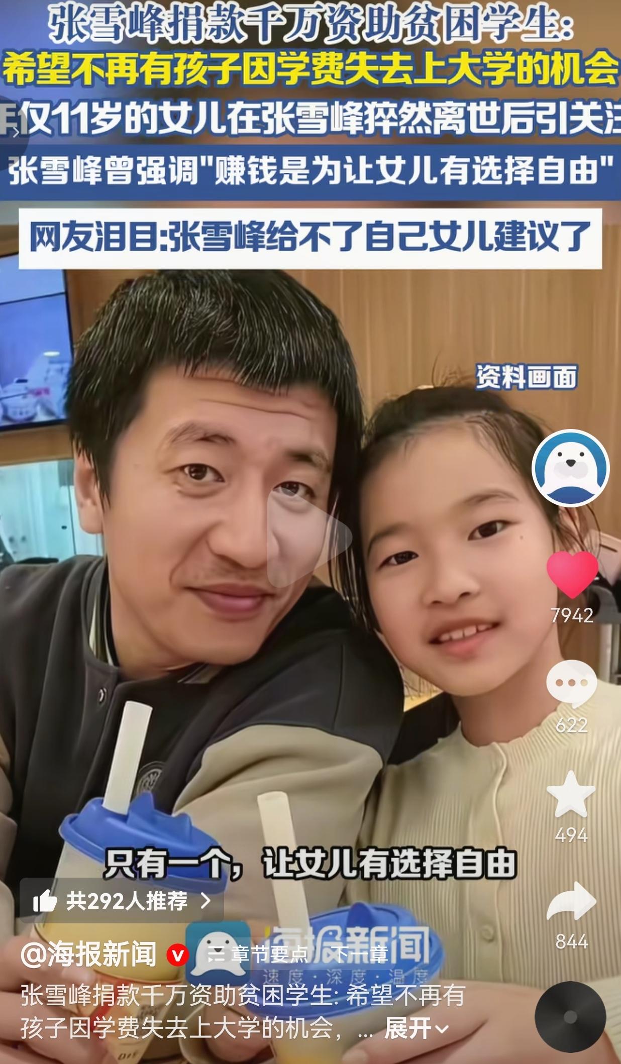 太痛心了!那个给千万家庭指路的张雪峰,倒在了41岁!再也给不了自己11岁女儿一句建议了! 3月24号中午,他还在跑步机上挥汗如雨,耳机里塞着歌,像往常一样给自己充能。谁能想到,这一跑,成了永别。 下午3点50分,那个靠一张嘴替无数寒门学子踩坑、给焦虑家长指路的张雪峰,因心源性猝死,永远停在了41岁。 他这辈子,骂过资本,怼过名校,把“选择比努力重要”喊得震耳欲聋,却把最柔软的地方,全给了自己11岁的女儿。 他拼了命赚钱,常说就一个理由——让我女儿有选择的自由,不用像他当年那样,为了学费低头,为了前途迷茫。 可现在呢?他给成千上万的孩子规划过高考志愿、职业方向,却再也没法坐在女儿身边,听她讲学校的趣事,没法在她填志愿时拍着胸脯说“爸给你兜底”;再也没法在海边把胳膊搭在她肩上,陪她慢慢走;再也没法看着她吹灭生日蜡烛,笑着说“我的宝贝又长大一岁”。 更戳人的是,这个被骂“功利”“市侩”的男人,私下里捐了快一千万给贫困学生。 给苏州教育基金会捐100万,备注“助学” 给母校郑州大学捐50万,定向帮寒门新生 回黑龙江老家,一甩手就是195万,给家乡孩子铺路 公司每年至少掏500万,就为了不让一个孩子因为学费,被拦在大学门外。 他晒的不是豪车名表,是一张又一张盖着红章的捐款回执单。有人骂他“作秀”,他直接怼:“我作秀能作好几年,捐出一千万,你作一个给我看看?” 网友看到后评论说:“破防了!他给我家孩子指过志愿的路,现在他自己的娃,连爸爸的一句建议都听不到了。” 也有的网友说:“当年我差点因为学费放弃大学,要是早认识张老师,说不定我也能拿到他的资助。他才是真的懂我们的苦。” 还有的网友说:“他说赚钱是为了女儿有选择自由,结果自己先倒下了。这世上最残忍的事,就是父亲给不了孩子未来了。” 也有的网友说:“别再说他功利了!他捐的每一分钱,都是在给我们这些底层人铺路。他骂的是不公,爱的是孩子。” 还有的网友说:“他教会我“选择比努力重要”,可他自己却没选到“好好活着”这条路。太疼了。” 我真的憋不住火!那些骂他“贩卖焦虑”的人,你们摸着良心问问自己:当你家孩子考了高分却被调剂到天坑专业时,是谁站出来喊“别报!这专业毕业就失业”? 当你为了孩子学费愁得睡不着时,是谁默默捐出几百万,给那些和你一样难的家庭托底? 当你被所谓“精英”嘲笑“不懂教育”时,是谁用最接地气的话,把升学的门道掰碎了喂给你? 他不是完美的人,他嘴碎,他爱钱,他会为了流量跟人吵架。可他的钱,一半给了女儿,一半给了跟他一样出身寒门的孩子;他的爱,给了家人,也给了无数素不相识的陌生人。 他拼尽全力,想给女儿一个不用看别人脸色的人生;他倾其所有,想给更多孩子一个能靠读书改变命运的机会。 这才是真正的爷们儿——对家人宠到骨子里,对陌生人暖到骨子里,对这个世界的不公,骂到骨子里。 张老师走了,但他留下的光还在:那些被他资助的孩子,会带着他的善意,继续走下去。那些被他点醒的家庭,会记得“选择比努力重要”,更记得“善良比成功重要”。 他11岁的女儿,会在无数人的祝福里长大,知道自己的爸爸,是个顶天立地的英雄。 他给千万人指了路,却没能陪自己的女儿走下去。但他用一生告诉我们:真正的成功,不是赚多少钱,而是你爱过多少人,照亮过多少路。