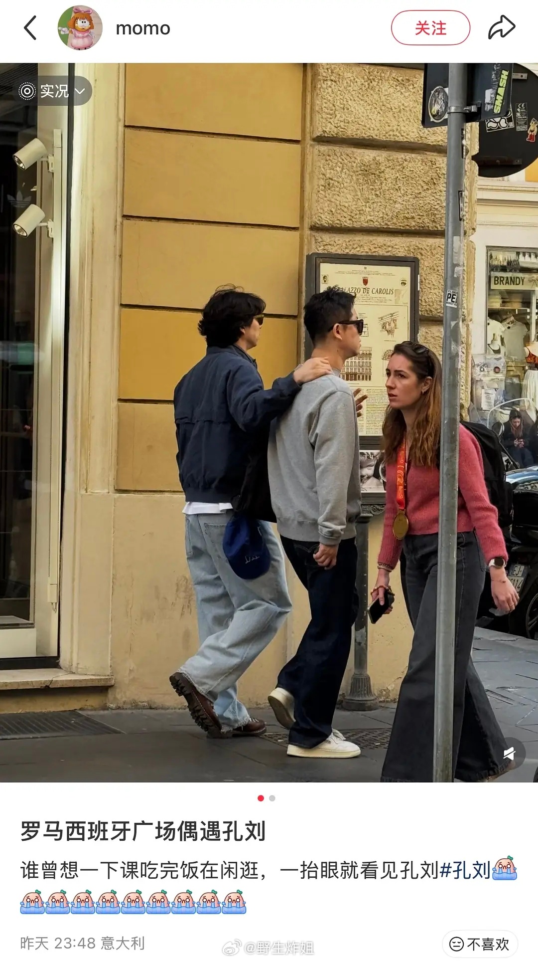 网友在意大利偶遇孔刘
