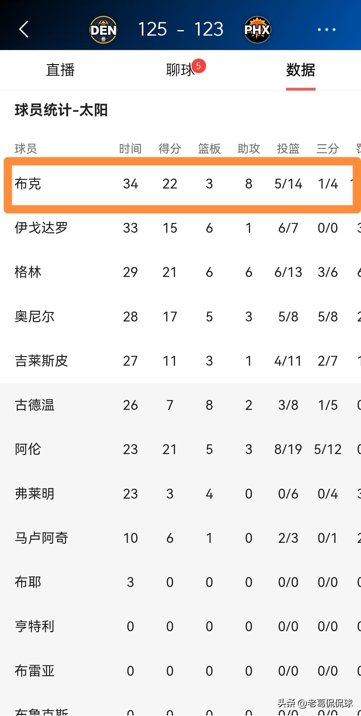 太阳当家球星布克真是一个伪巨星!在今天太阳主场以123:125不敌掘金的比赛中,贵为超级巨星的布克不仅没有打出超级球星的表现,而且在比赛最后时刻浪费了一次绝杀机会。 全场比赛下来,布克首发出战34分钟,投篮14中5,其中三分球4中1、罚球13中11得到22分3篮板8助攻。 虽然布克和约基奇都被誉为当今联盟的超级巨星,但是和约基奇的无解表现进行比较的话,布克俨然是一个伪巨星。