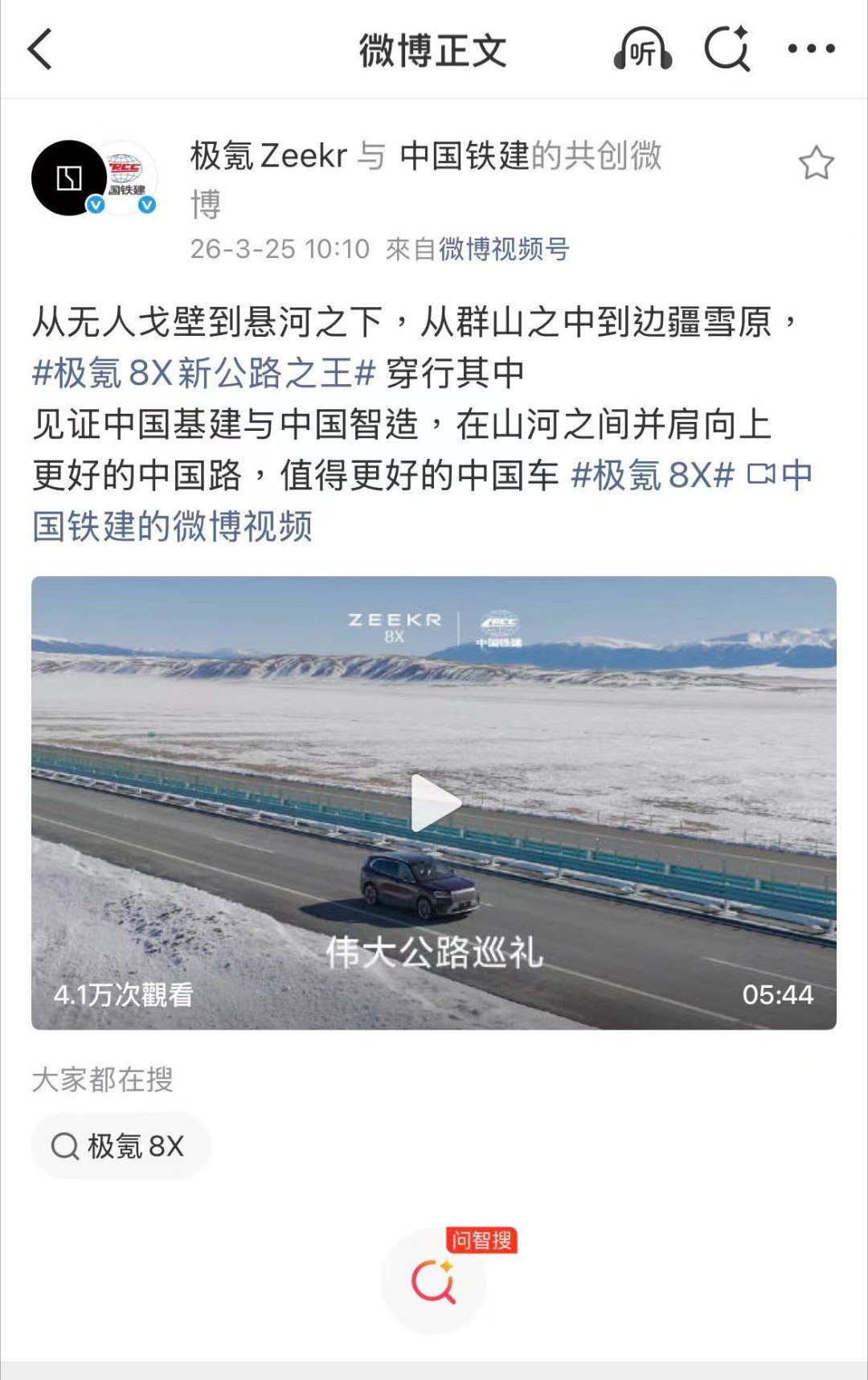 咱们“基建狂魔”中国铁建真不是吹的!从平原高原、荒漠雪域,全世界都有咱们修出来的硬核公路,路这么顶,车自然也不能差,极氪8X这不就刚好对上了~靠着SEP浩瀚超级电混、AI数字底盘,再加千里浩瀚G-ASD智驾,什么复杂路况都能轻松hold住;在中国新能源和中国基建双双崛起的今天,一台能把性能、通过性、续航、智能全都拉满,还真正懂国人出行的旗舰SUV,这才是它敢叫“新公路之王”的底气!极氪回应中铁建邀请